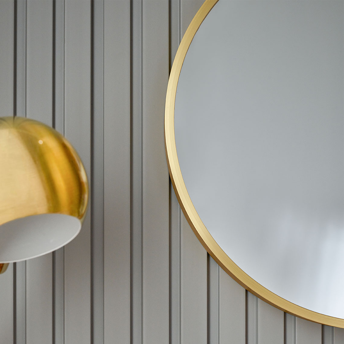 Lustro Leen posiada okrągłą metalową ramę w kolorze złotym.