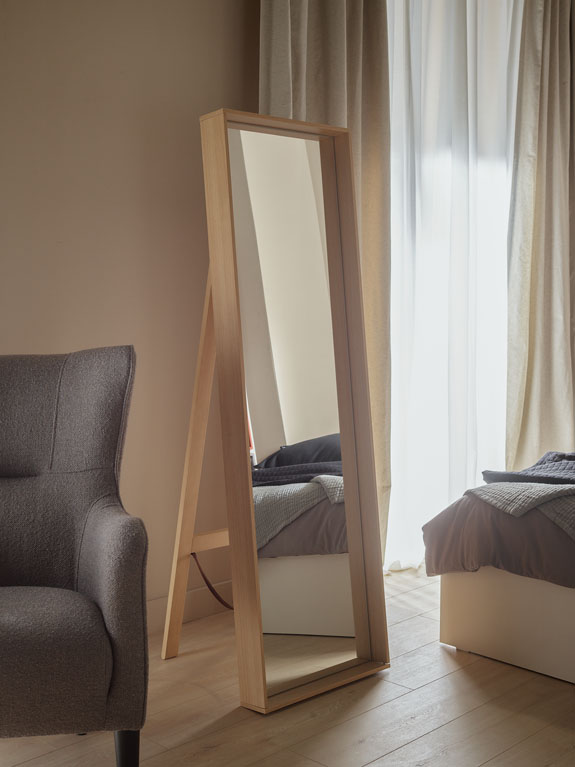 - Uniwersalna, wolnostojąca konstrukcja lustra sprawia, że możesz go użyć w każdym pomieszczeniu – sypialni, garderobie i nie tylko. Co więcej, nie trzeba przytwierdzać go na stałe do ściany, więc możesz przestawić je, gdy wpadniesz na nowy pomysł na wystrój wnętrza.