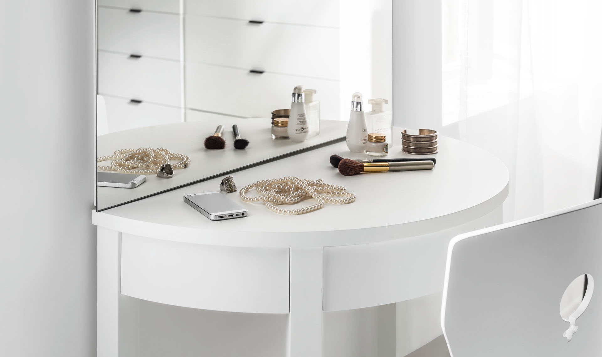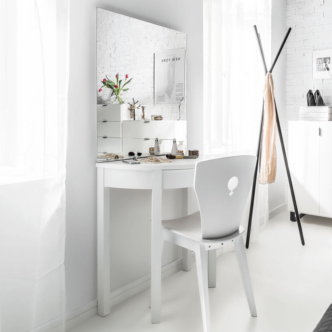 Lustro może wisieć jako samodzielny element na ścianie lub przy toaletce z kolekcji Simple. Jego szerokość idealnie pasuje do wymiarów toaletki i gdy zawieszone jest tuż nad nią, powiększa optycznie toaletkę, tworząc z niej okrągły stolik.