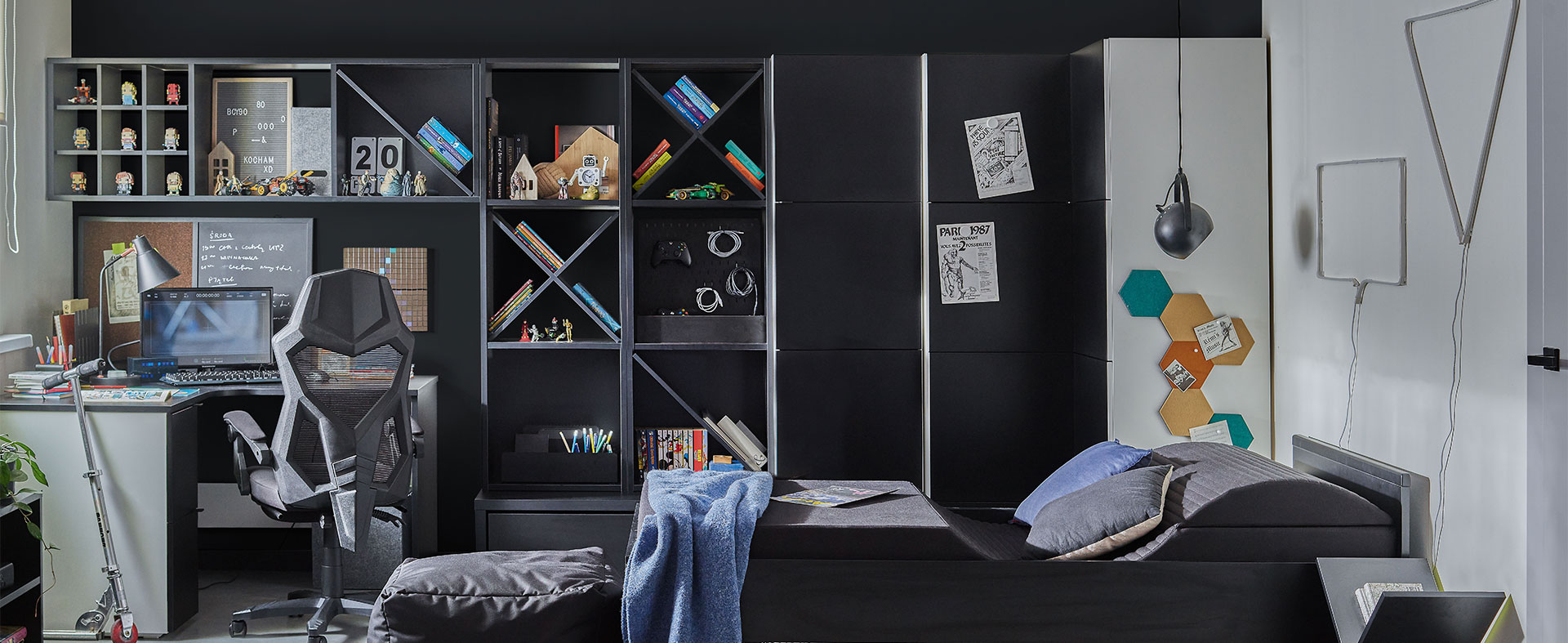 - Meble Young Users są otwarte na estetyczne eksperymenty. Użyj metalowych nakładek na front, aby nadać biurku własny i niepowtarzalny charakter.