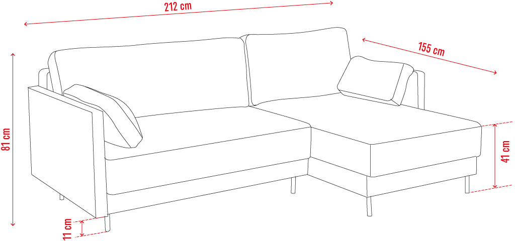 - Model został wyposażony w smukłe czarne nóżki o wysokości 11 cm. Dzięki nim narożnik zyskuje wizualną lekkość, a sprzątanie pod nim jest łatwiejsze.