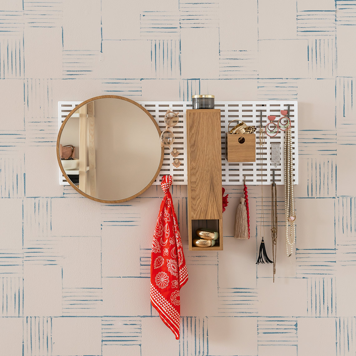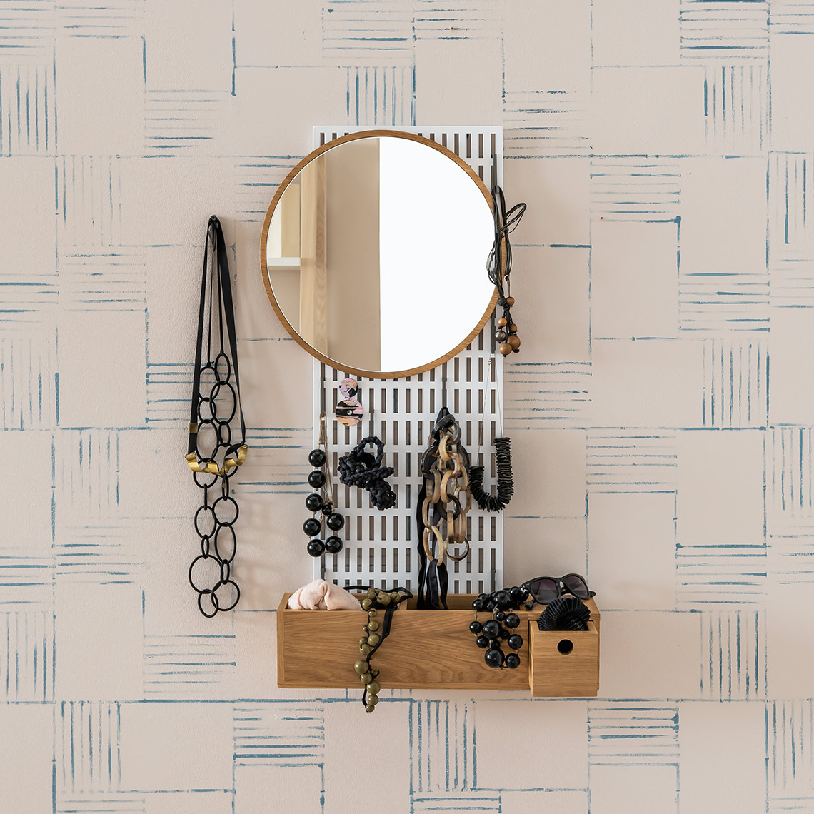 - Organizer Mesh może także pełnić rolę toaletki. Bardzo często w sypialniach nie ma miejsca na klasyczny mebel do wykonywania makijażu i przechowywania biżuterii. Mesh - zawieszony na ścianie doskonale spełni taką funkcje. W pudełkach możesz umieścić kosmetyki, na haczykach powiesić biżuterię a lustro umieścić na dowolnej wysokości.