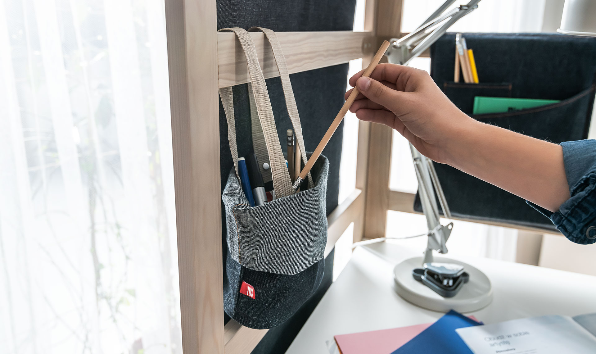 Jeansowy organizer wiszący można z łatwością przymocować do drabinek łóżka, kanapy lub biurek z kolekcji Stige.