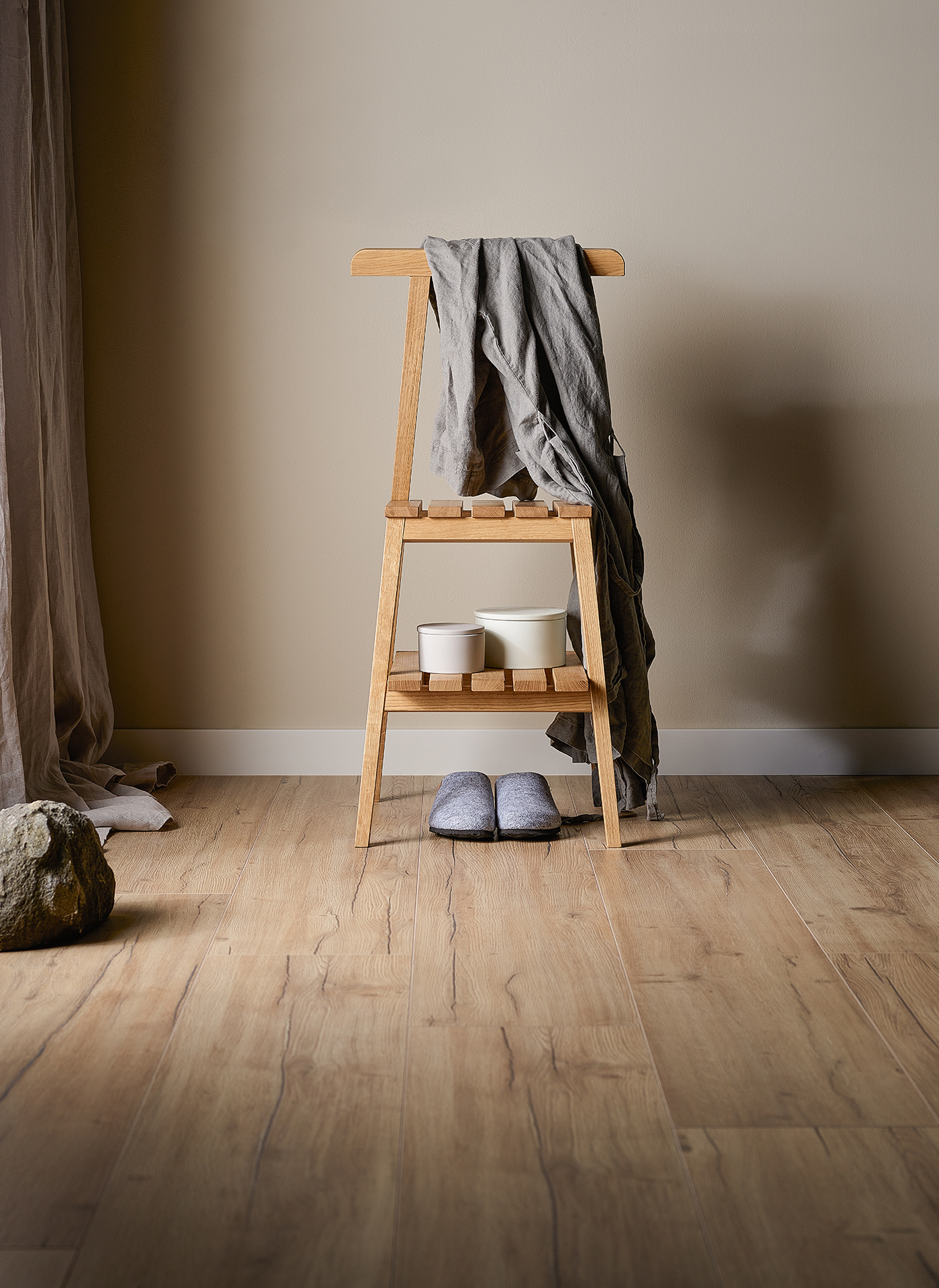 Wzmocniona górna warstwa podłogi Querra Balance Plus WR zapewnia zwiększoną odporność na mikrozarysowania, dzięki czemu jej struktura postarzonego drewna utrzymuje się przez lata. Panel Dąb Skogen o wysokiej klasie ścieralności AC5, dzięki bardziej szczelnemu zamkowi i dodatkowym zabezpieczeniom umożliwia montaż paneli w pomieszczeniach o zwiększonej wilgotności (z wyłączeniem sauny i strefy prysznica).