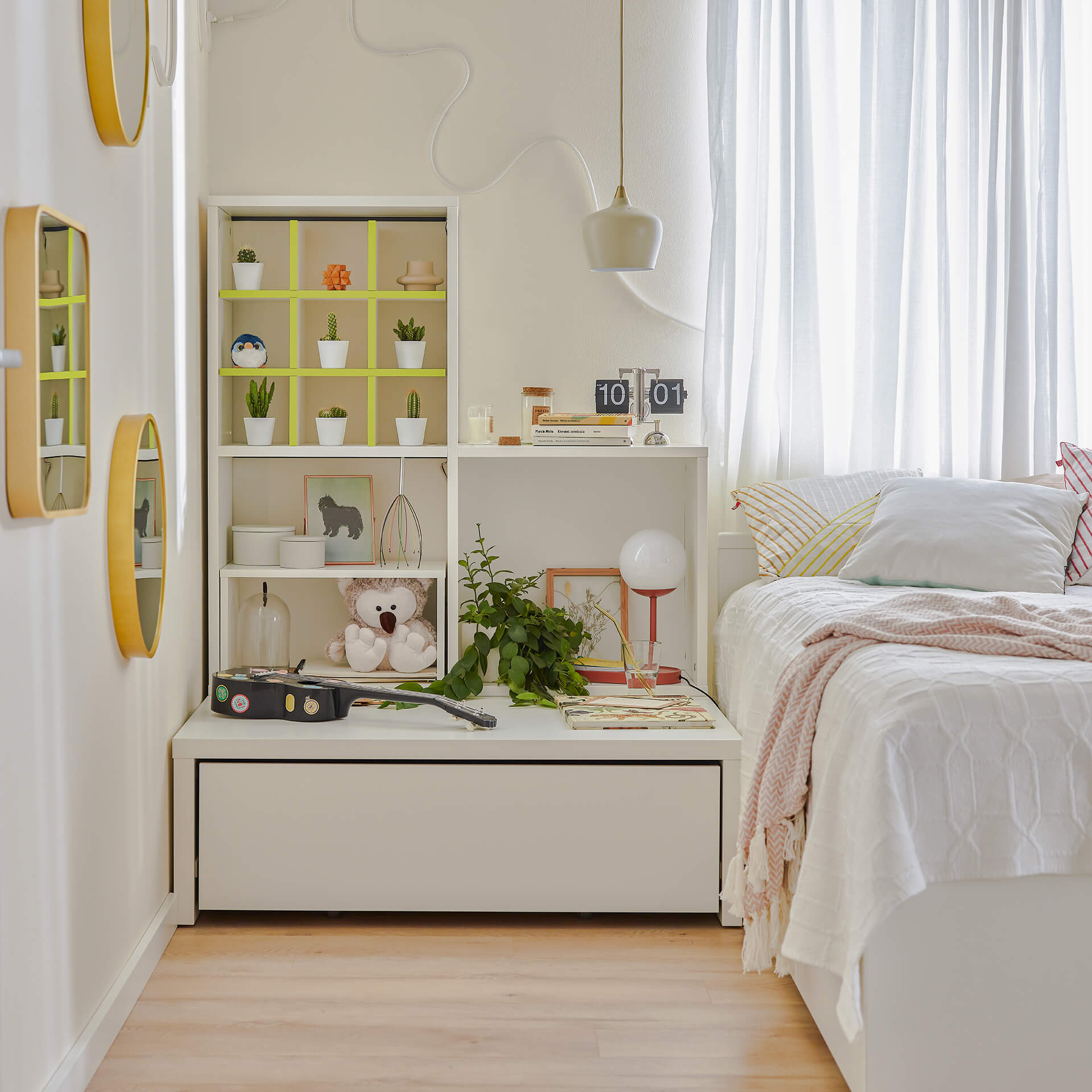 - Na podeście można ustawić zamknięty regał, szeroką komodę czy 2-drzwiową szafę z serii Young Users. Pamiętaj, by połączyć całość za pomocą dołączonych do zestawu okuć, a dodatkowo przytwierdzić zabudowę do ściany.