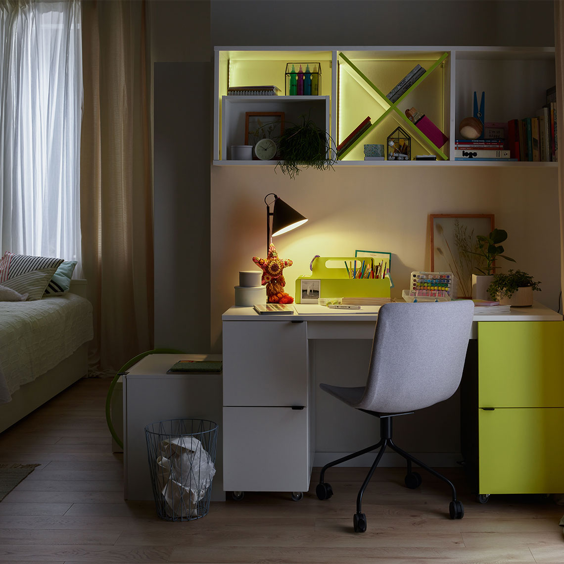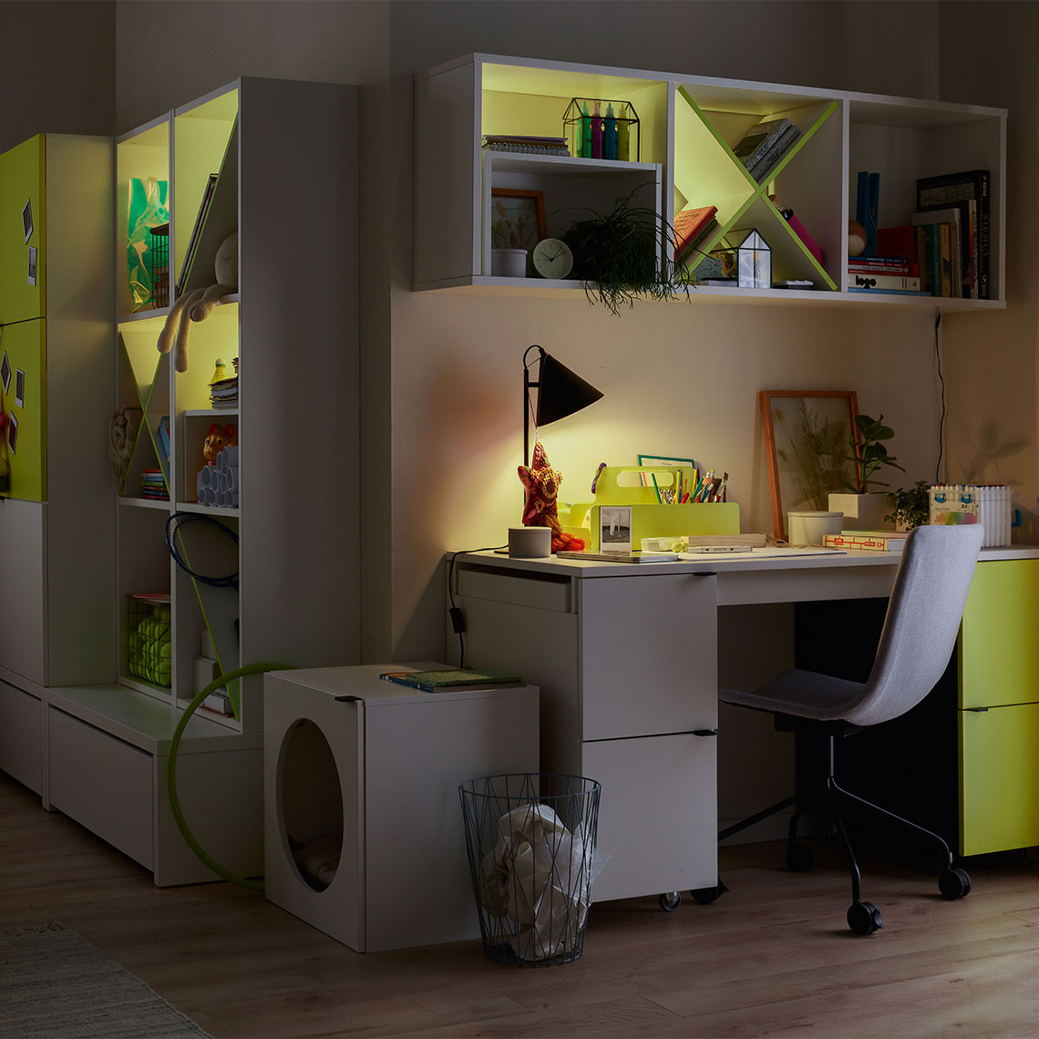 Zestaw LED RGB pozwala rozjaśnić wnętrza otwartych regałów z kolekcji Young Users ambientowym światłem, tworzącym niezwykły klimat w pomieszczeniu. Profile wystarczy przykleić w wybranych wnękach, by efektownie wyeksponować swoje ulubione kolekcje. Oświetleniem można swobodnie sterować za pomocą bezprzewodowego pilota.