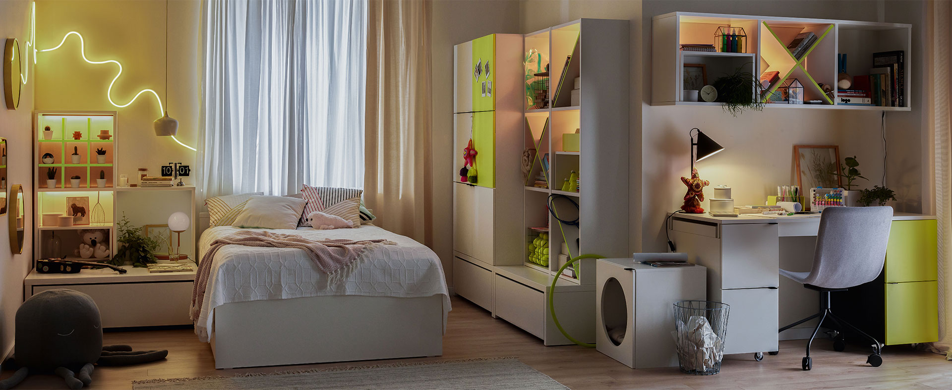 - Jeśli szukasz kreatywnego oświetlenia do młodzieżowego pokoju, w naszej ofercie znajdziesz też elastyczny pasek LED Twinkly Flex z inteligentnym sterowaniem, który może stworzyć dowolny kształt na ścianie.