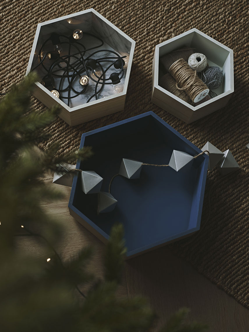 Mogą funkcjonować w poziomie jako pojemniki oraz w pionie jako oryginalne ramki eksponujące wybrane przedmioty. Każdy element posiada w komplecie zawieszki ząbkowe do powieszenia na ścianie.