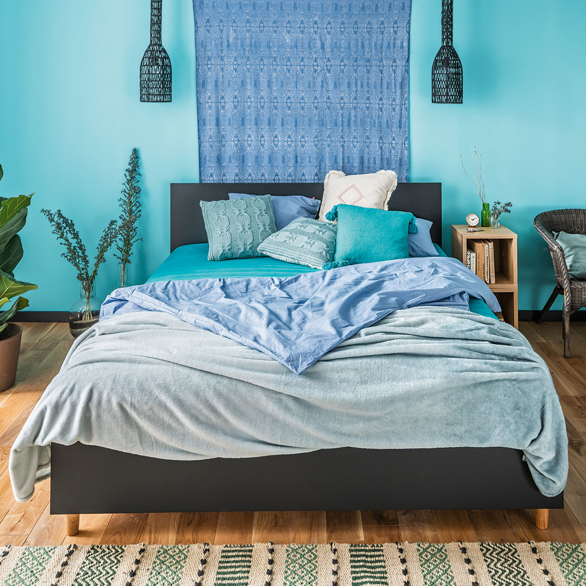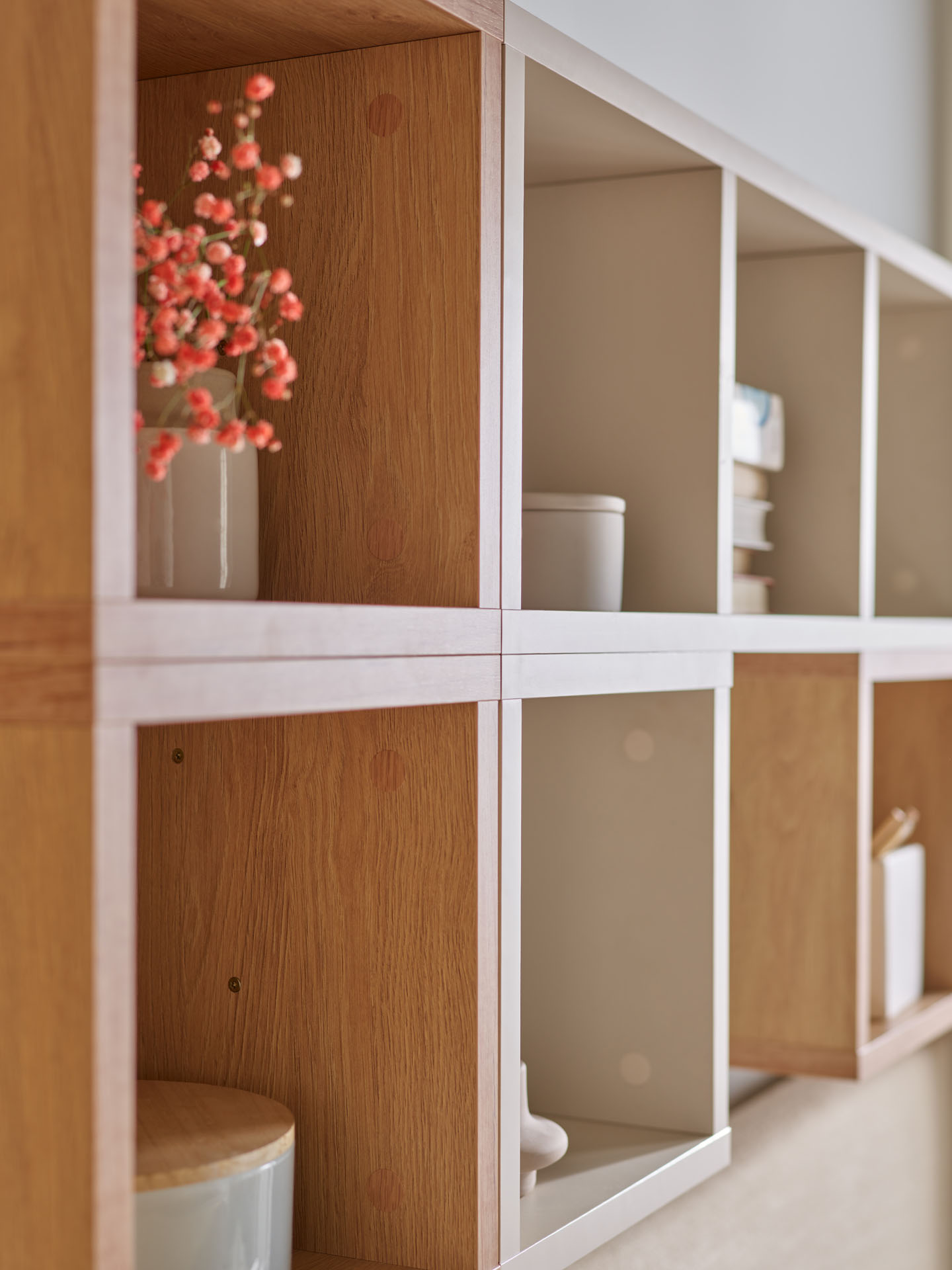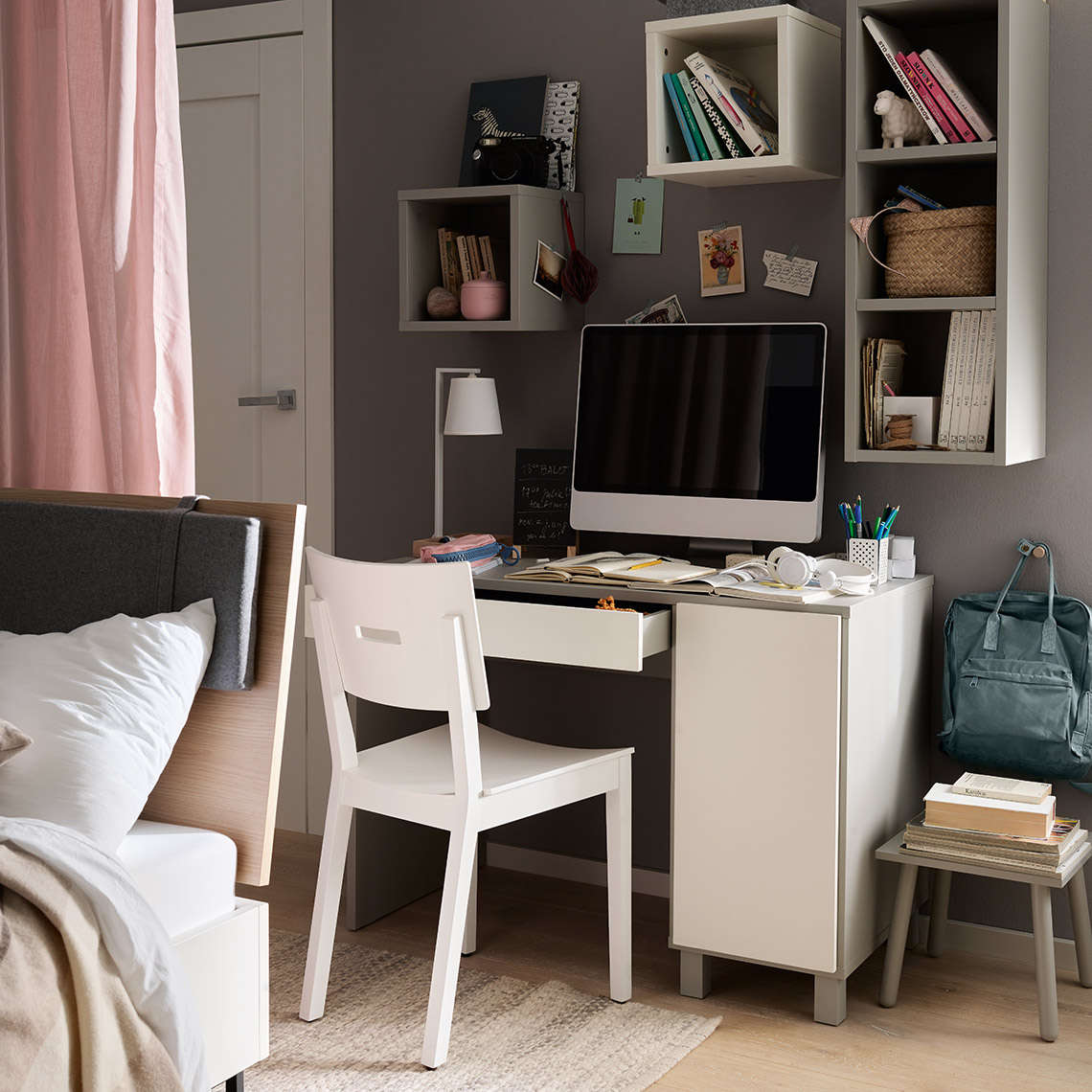 Półka dostępna jest w 4 kolorach: białym, szarym, czarnym oraz dębowym. Możesz ją zamontować na ścianie pojedynczo lub zmultiplikować w kilku kolorach tworząc tym samym ciekawą aranżację na ścianie. Półka może także stać na ziemi i pełnić rolę małego stoliczka.