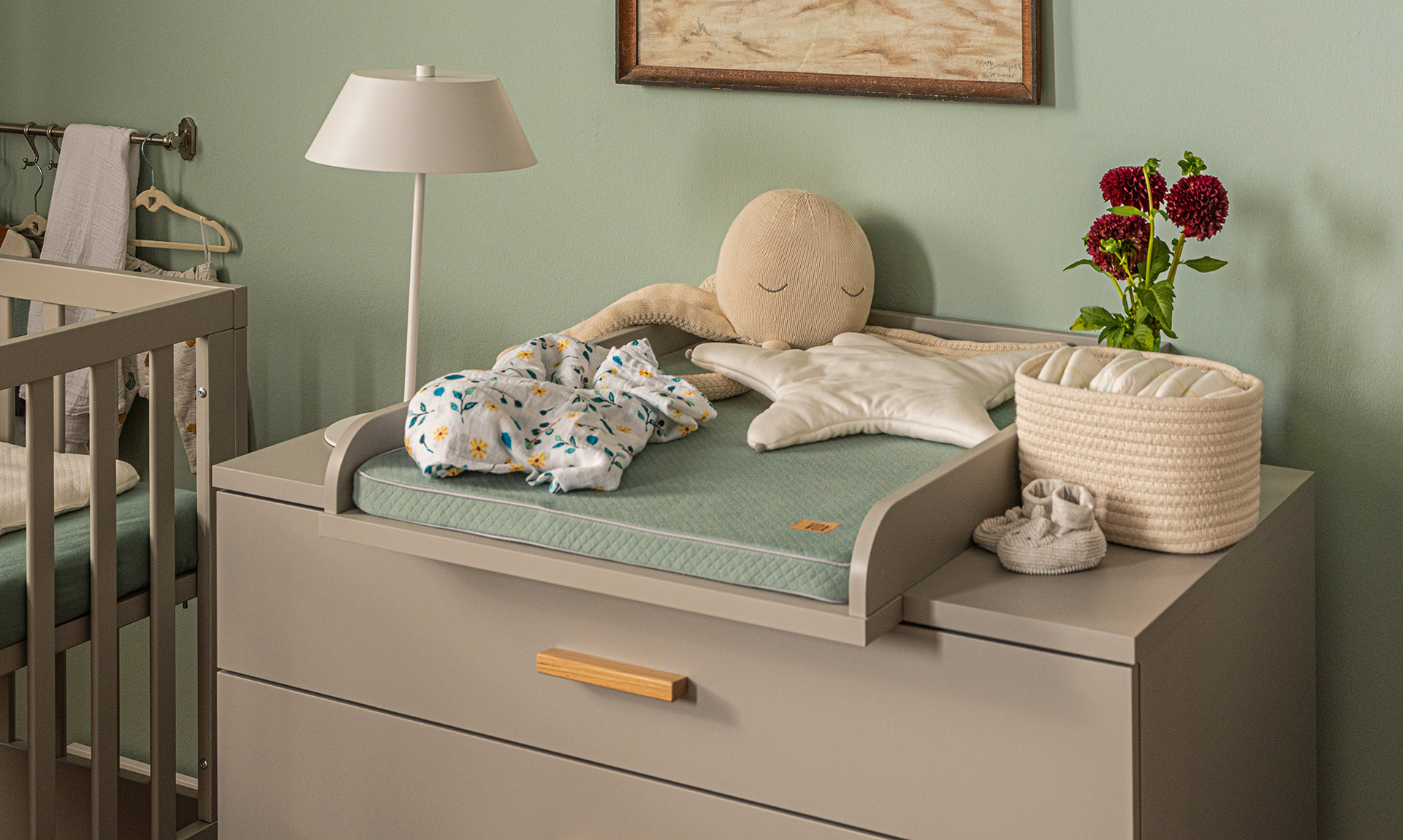 Przewijak Lounge pozwala na wygodną i bezpieczną pielęgnację maluszka. Równocześnie zapewnia przestrzeń na blacie do przechowywania kosmetyków i pieluszek. Jest dostosowany do komody z tej samej kolekcji.