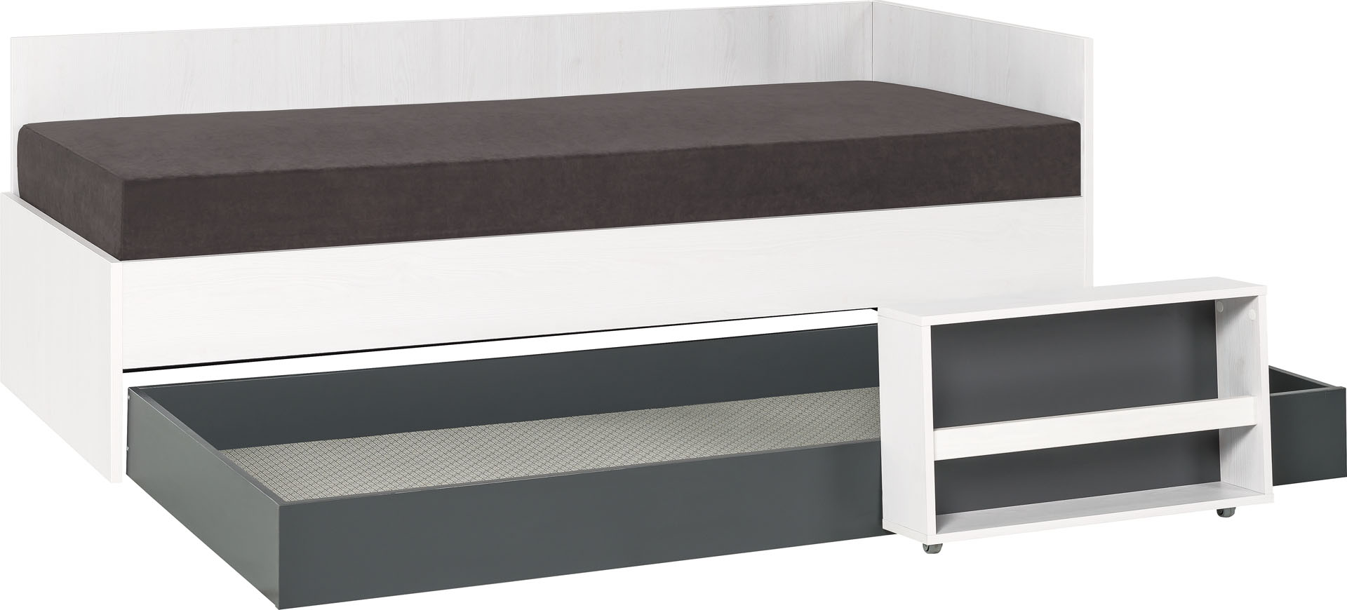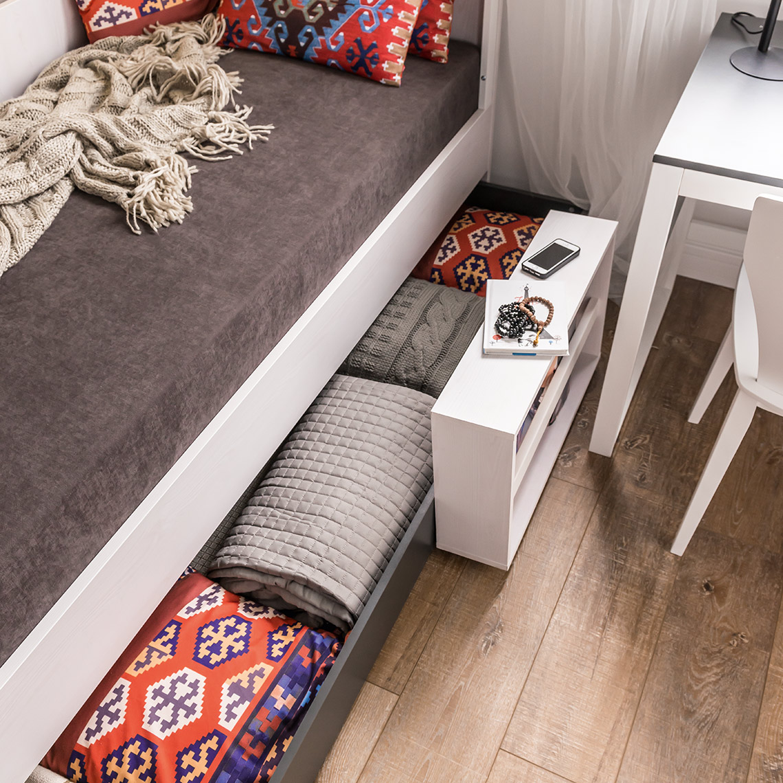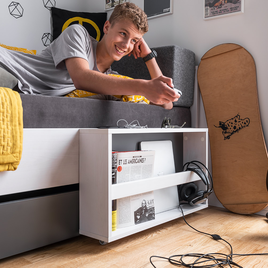 Przybornik nie jest samodzielnym elementem. Funkcjonuje przytwierdzony do szuflady kanapy lub łóżka 90x200 z kolekcji Nest by VOX i pełni rolę stolika nocnego.