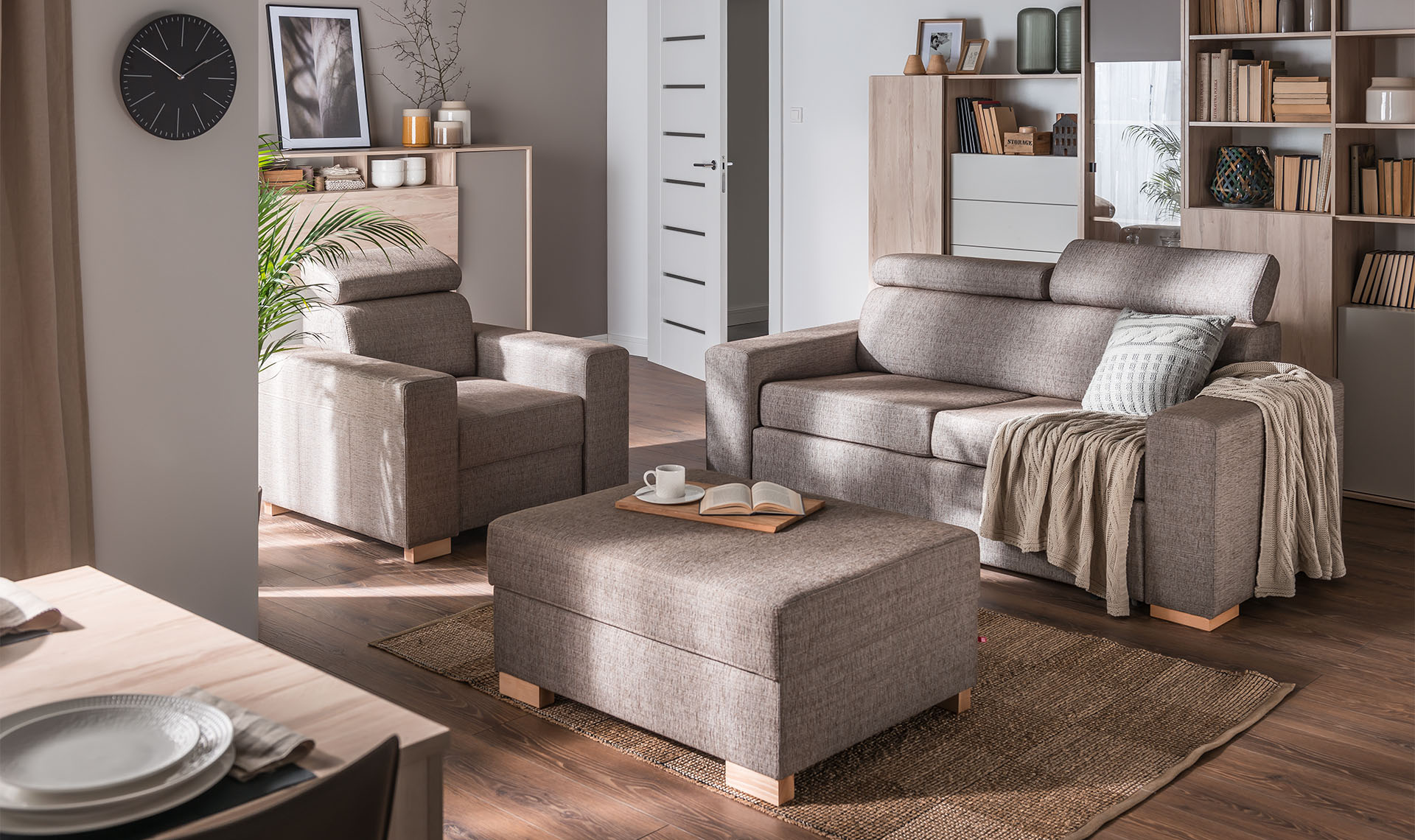 - Elegancki puf można zestawić z fotelem lub sofą, tworząc komfortowe miejsce do wypoczynku w pozycji półleżącej. Podnóżek ma taką samą wysokość jak siedziska.