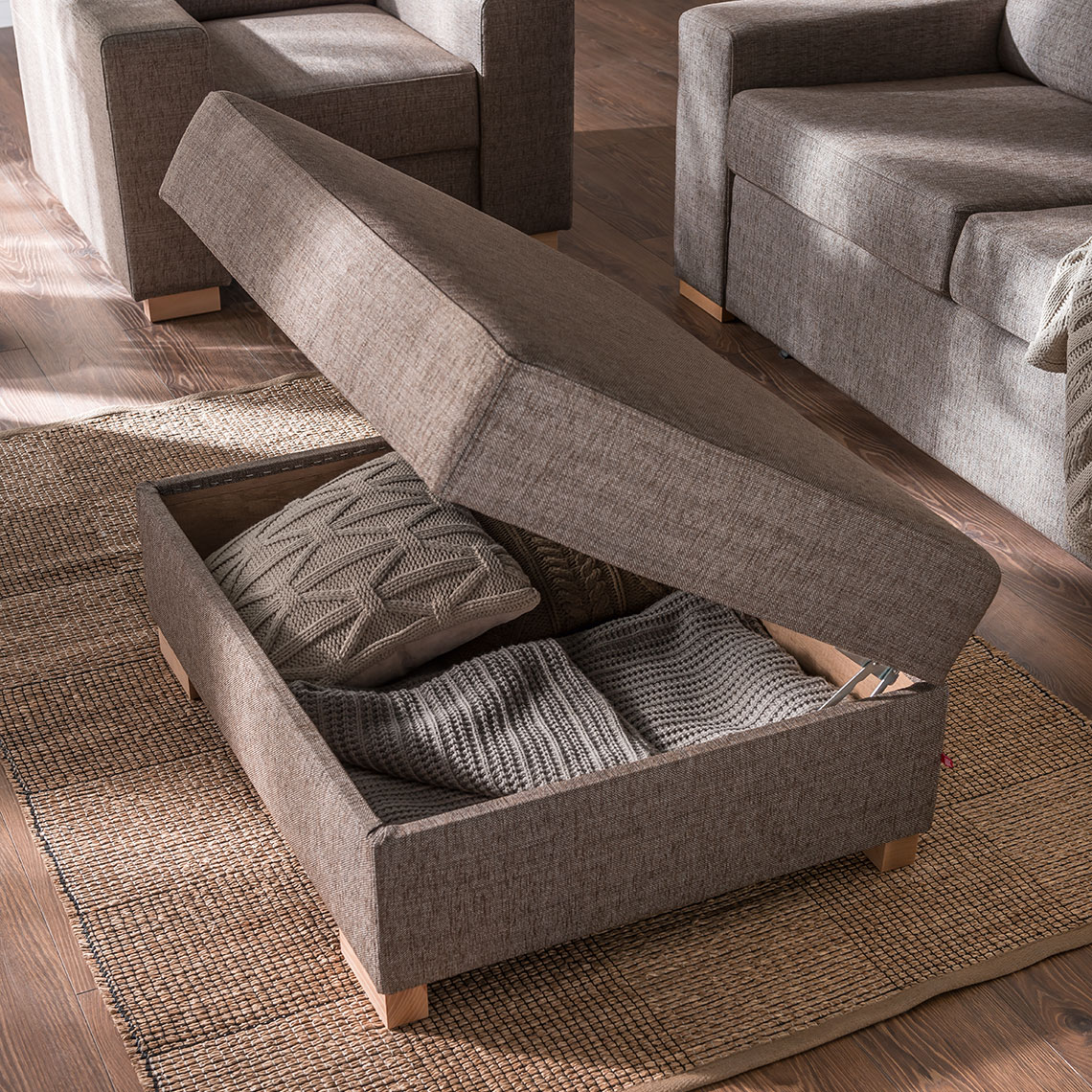 - Pod miękkim siedziskiem znajduje się pojemnik – będzie dobrym miejscem do przechowywania pledów, poduszek lub dziecięcych zabawek.