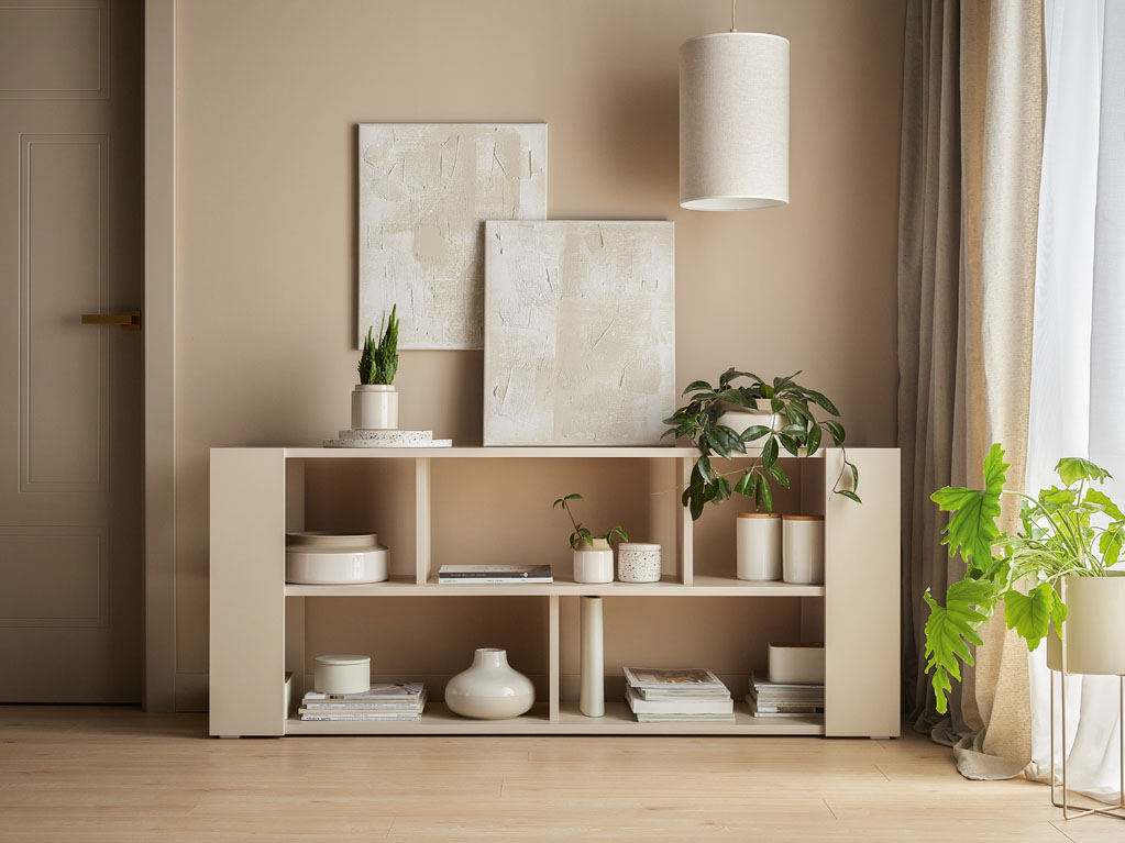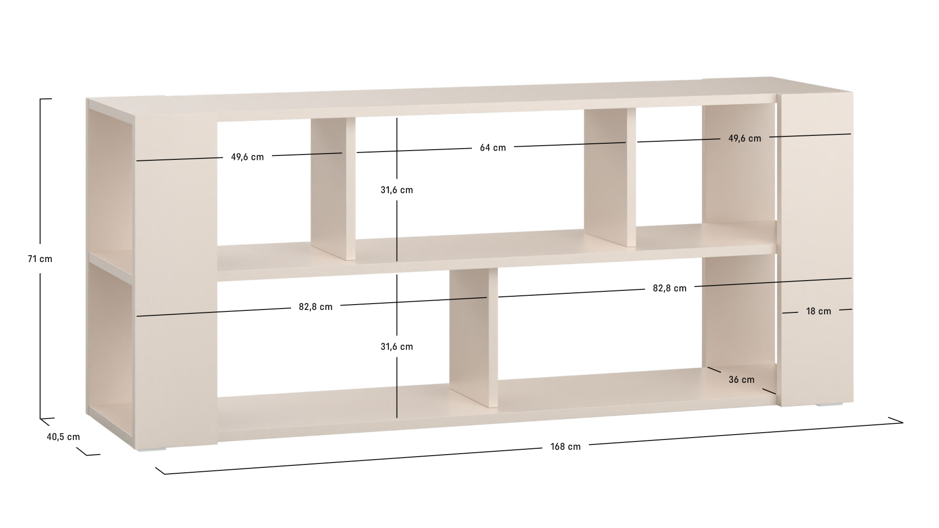 - Poprzeczne asymetryczne półki we wnętrzu regału ułatwiają organizowanie rzeczy. Można wykorzystać je do przechowywania książek i czasopism lub zaprezentowania domowej kolekcji roślin.