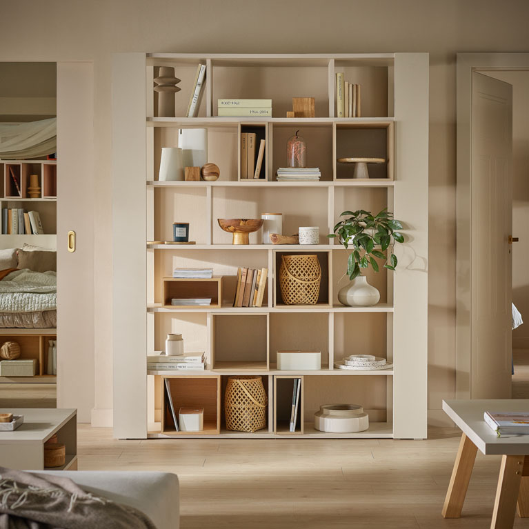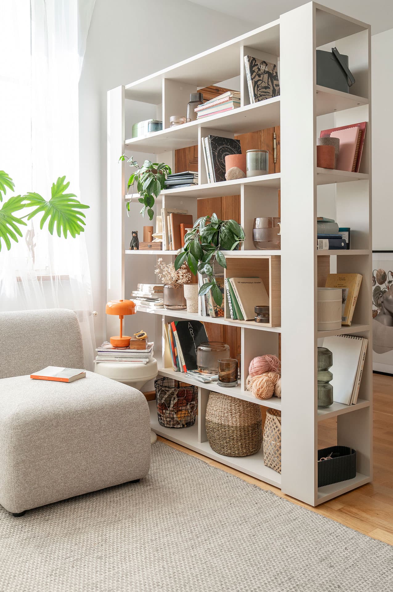- Regał został zaprojektowany w taki sposób, aby dostęp do jego zawartości był z trzech stron, dzięki czemu może stać w dowolnym miejscu pokoju, tworząc przy tym oryginalną ściankę działową. Korzystając z dedykowanego mocowania, można stabilnie przykręcić jeden z jego wąskich boków do ściany.