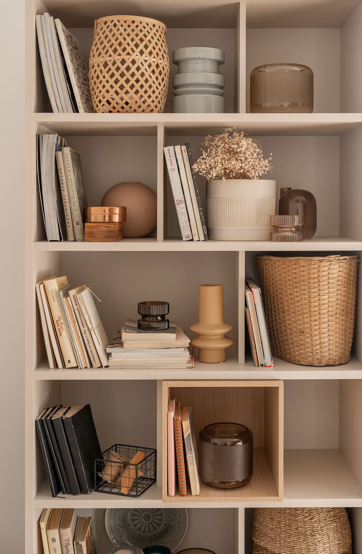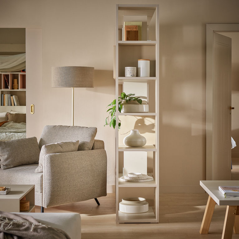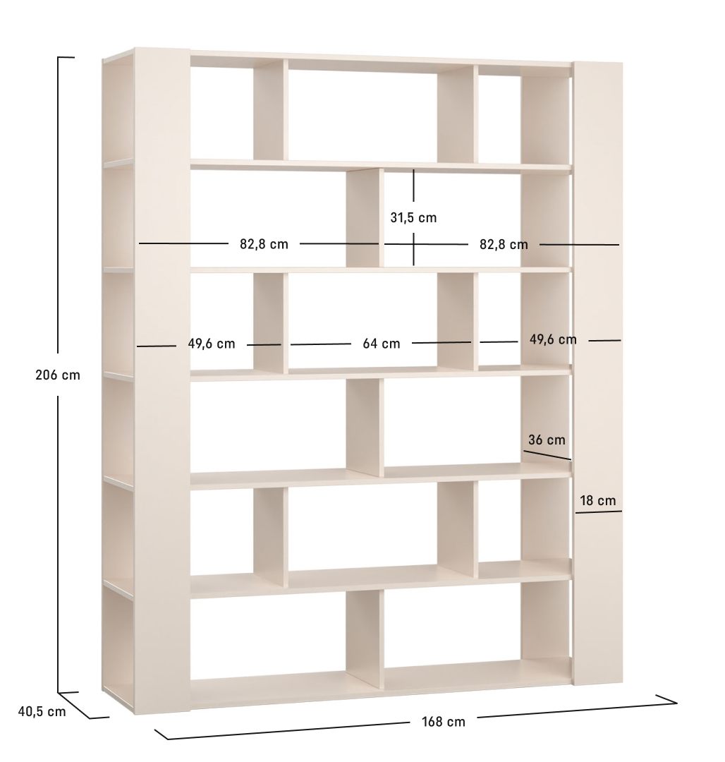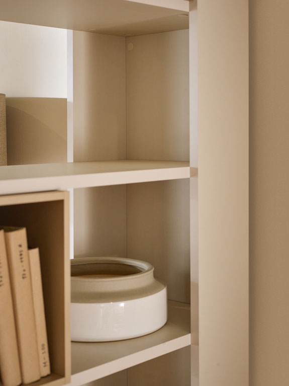 - Korpus oraz półki regału mają kolor piaskowego beżu.