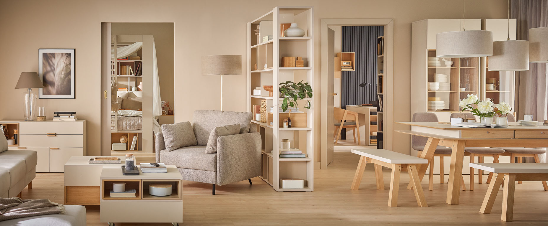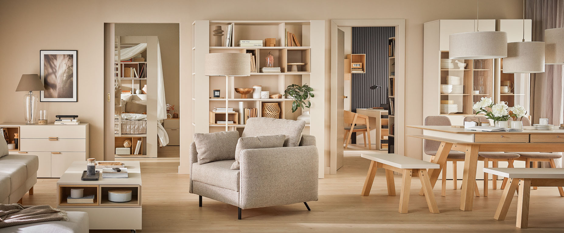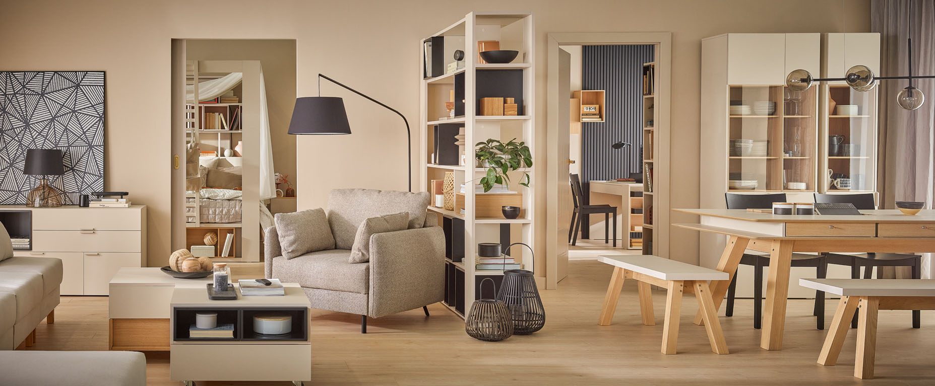 - Korpus oraz półki regału mają kolor piaskowego beżu.