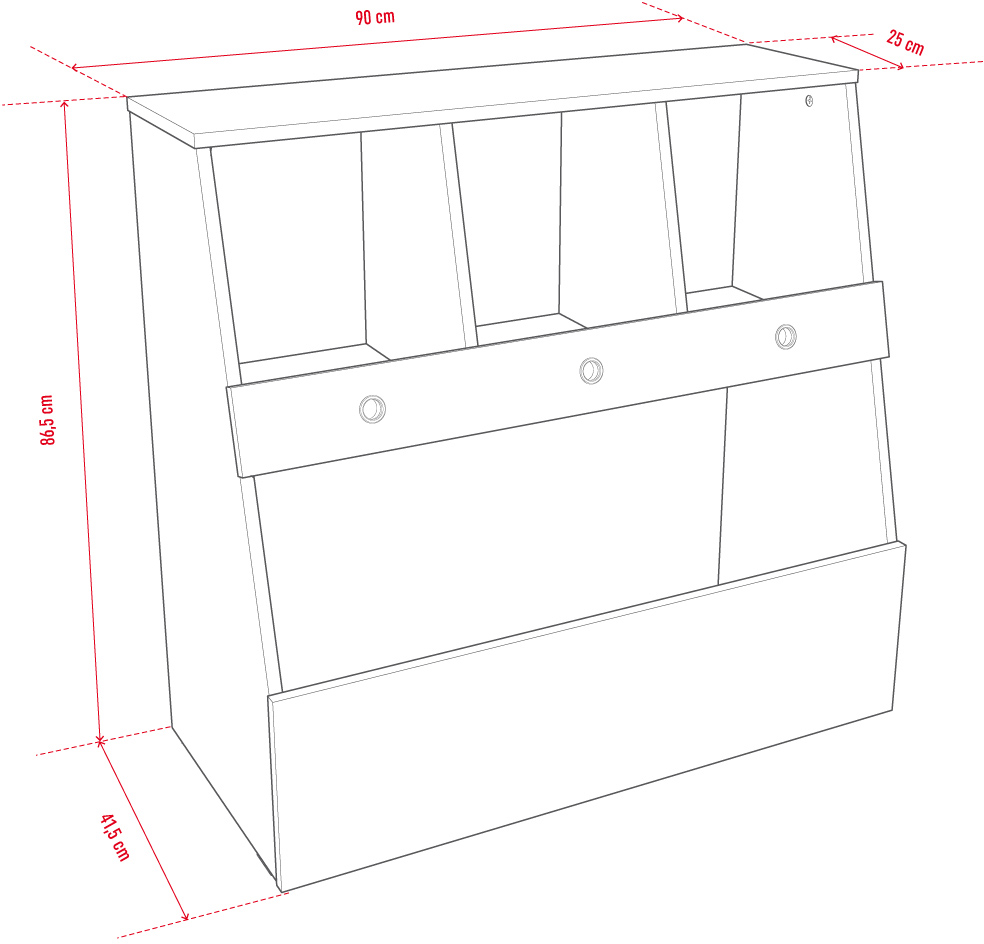 • Mebel jest głębszy u dołu i płytszy na górze. Zwężająca się konstrukcja zapewnia regałowi wysoką stabilność i ułatwia przechowywanie zabawek i książeczek o różnych rozmiarach.