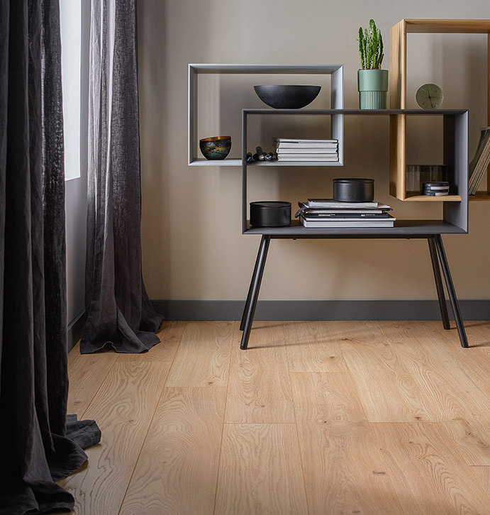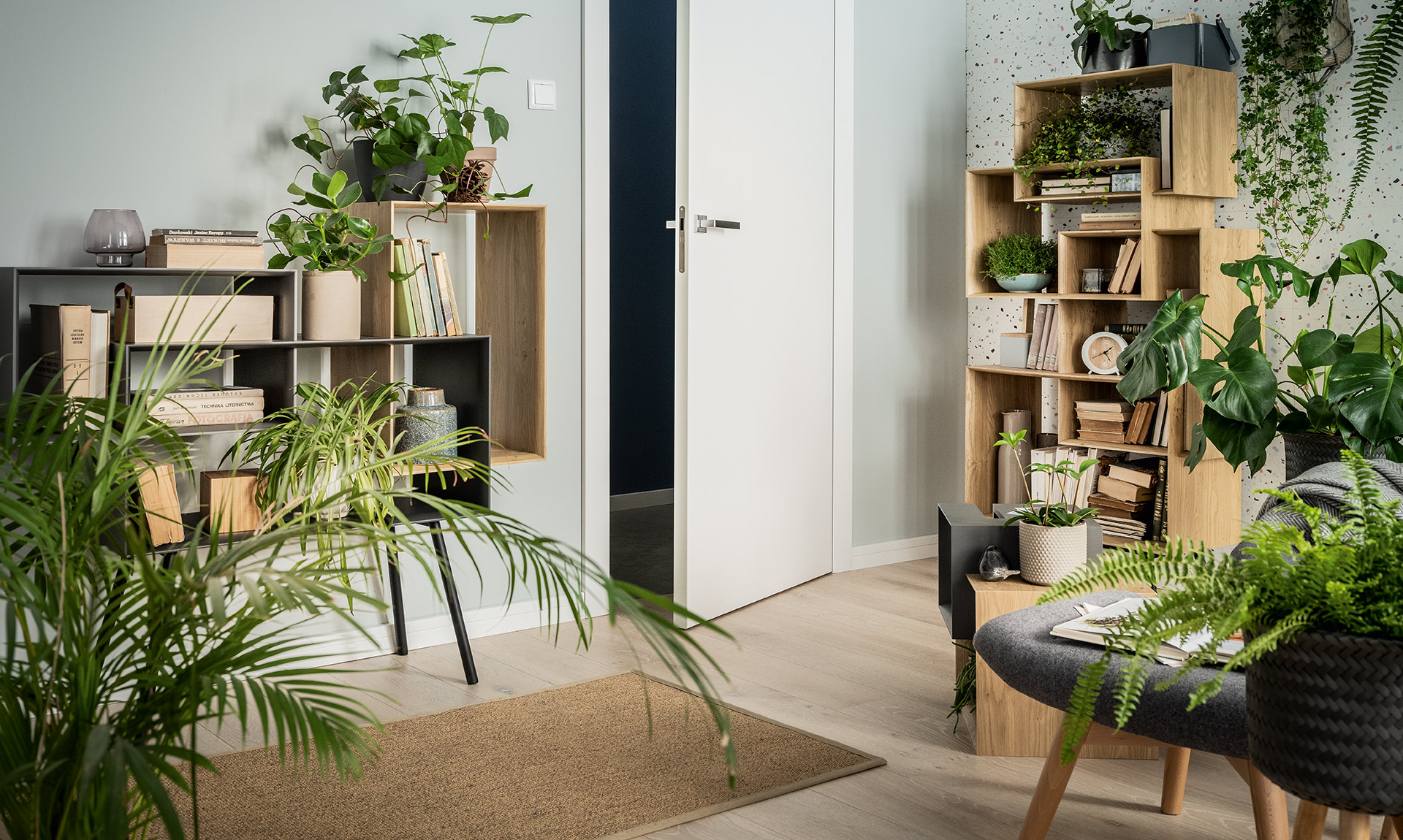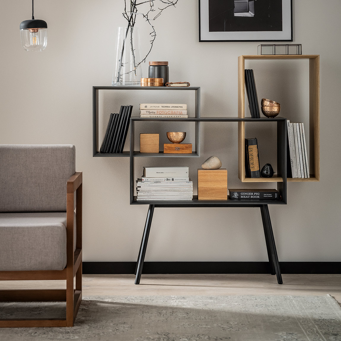 Brak tylnej ściany oraz wysokie nogi regału powodują że nabiera on optycznej lekkości. Dodatkowo wysokie nogi ułatwiają sprzątanie pod meblem.