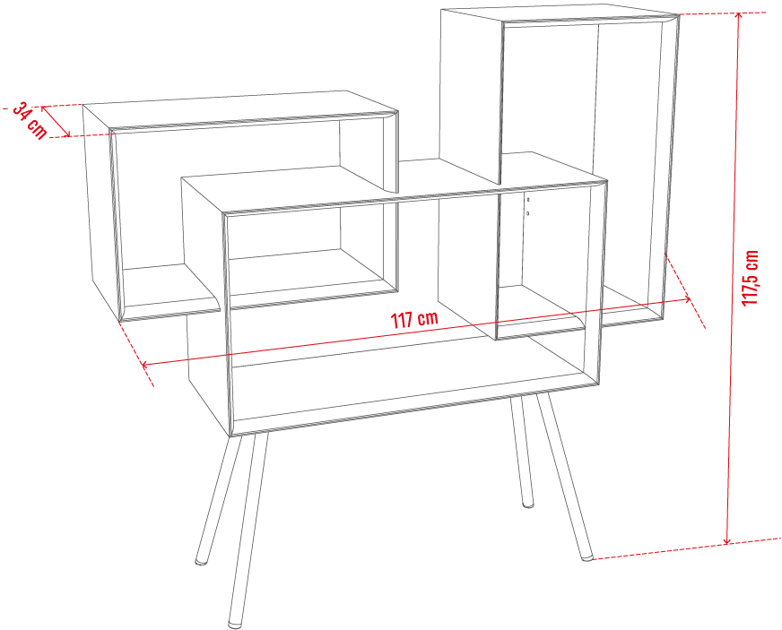 Przestrzenie różnej wielkości pozwalają na przechowywanie przedmiotów o zróżnicowanych rozmiarach. Zabieg ten sprawia również, że regał sam w sobie ma ciekawy kształt.