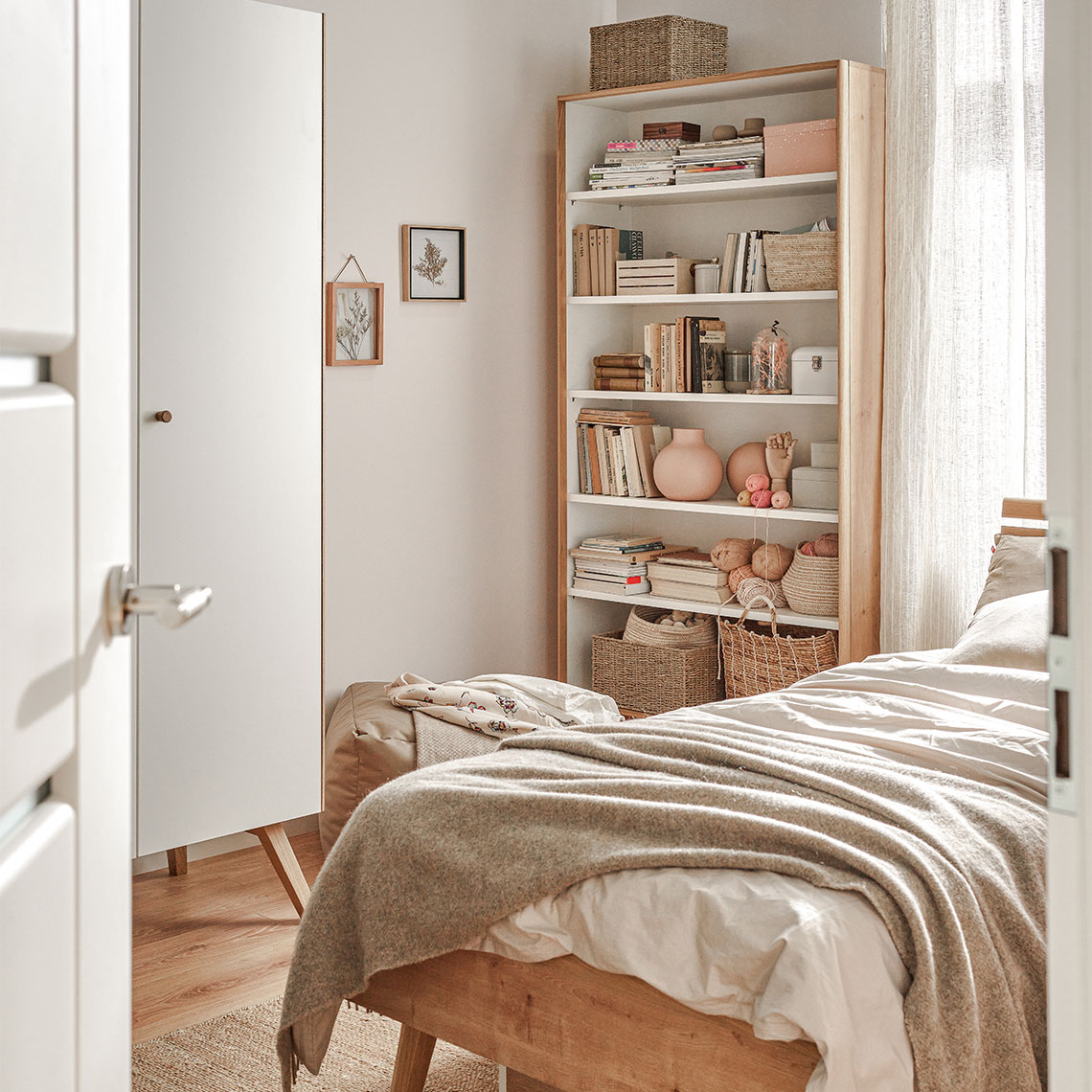 Minimalistyczny regał z kolekcji Nature z łatwością pomieści domową biblioteczkę. Na pojemnych półkach postawisz ulubione książki, doniczki z roślinami czy ozdobne pudełka z drobiazgami. Konstrukcja tego mebla jest na tyle mocna, że bez trudu wytrzyma dodatkowe obciążenia.