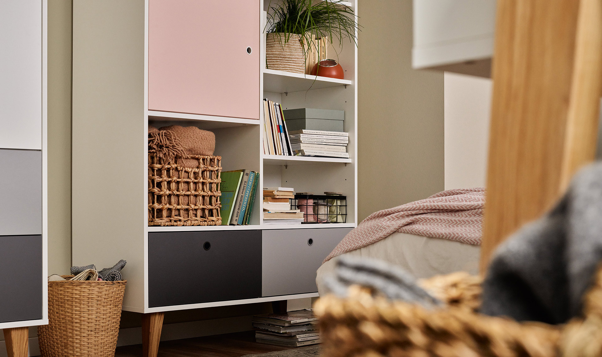 - Wysokość pięciu otwartych półek można dowolnie regulować, co pozwala na zorganizowanie przestrzeni zgodnie z własnymi potrzebami. Pomieszczą one podręczniki, notesy, albumy czy ulubione serie powieści.