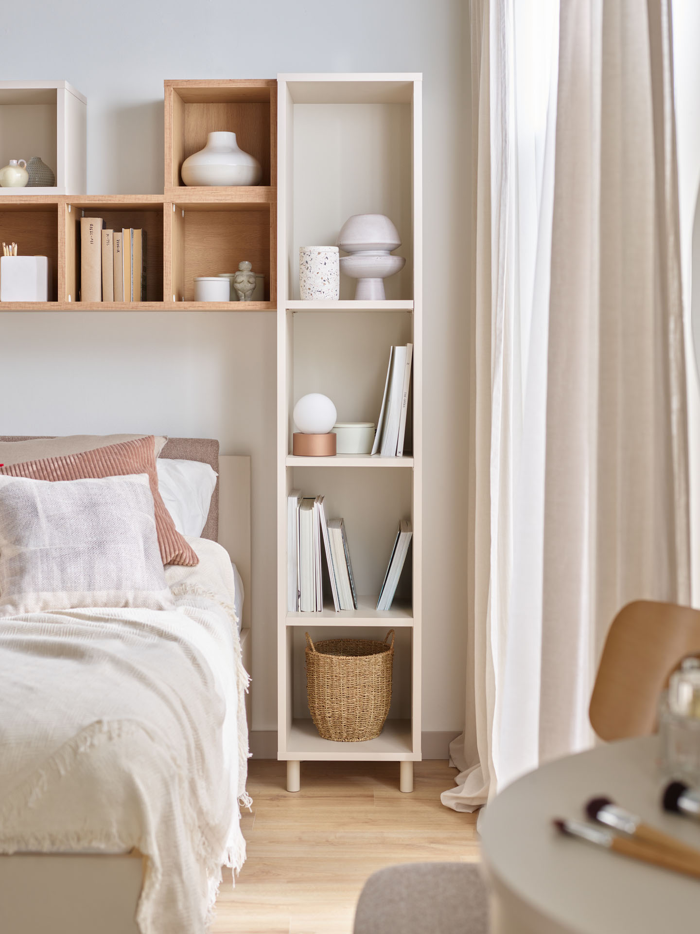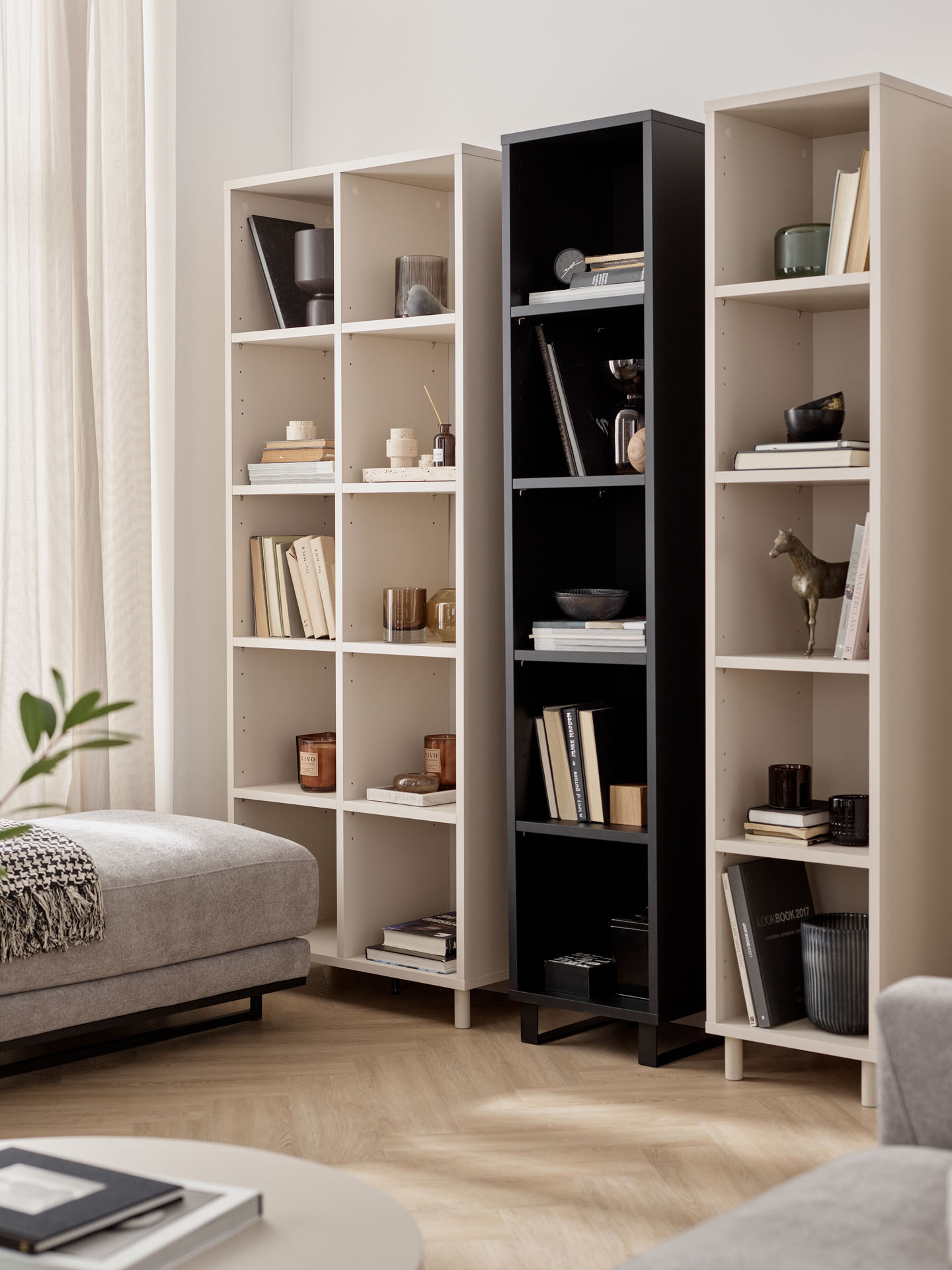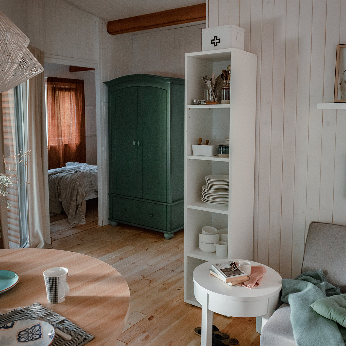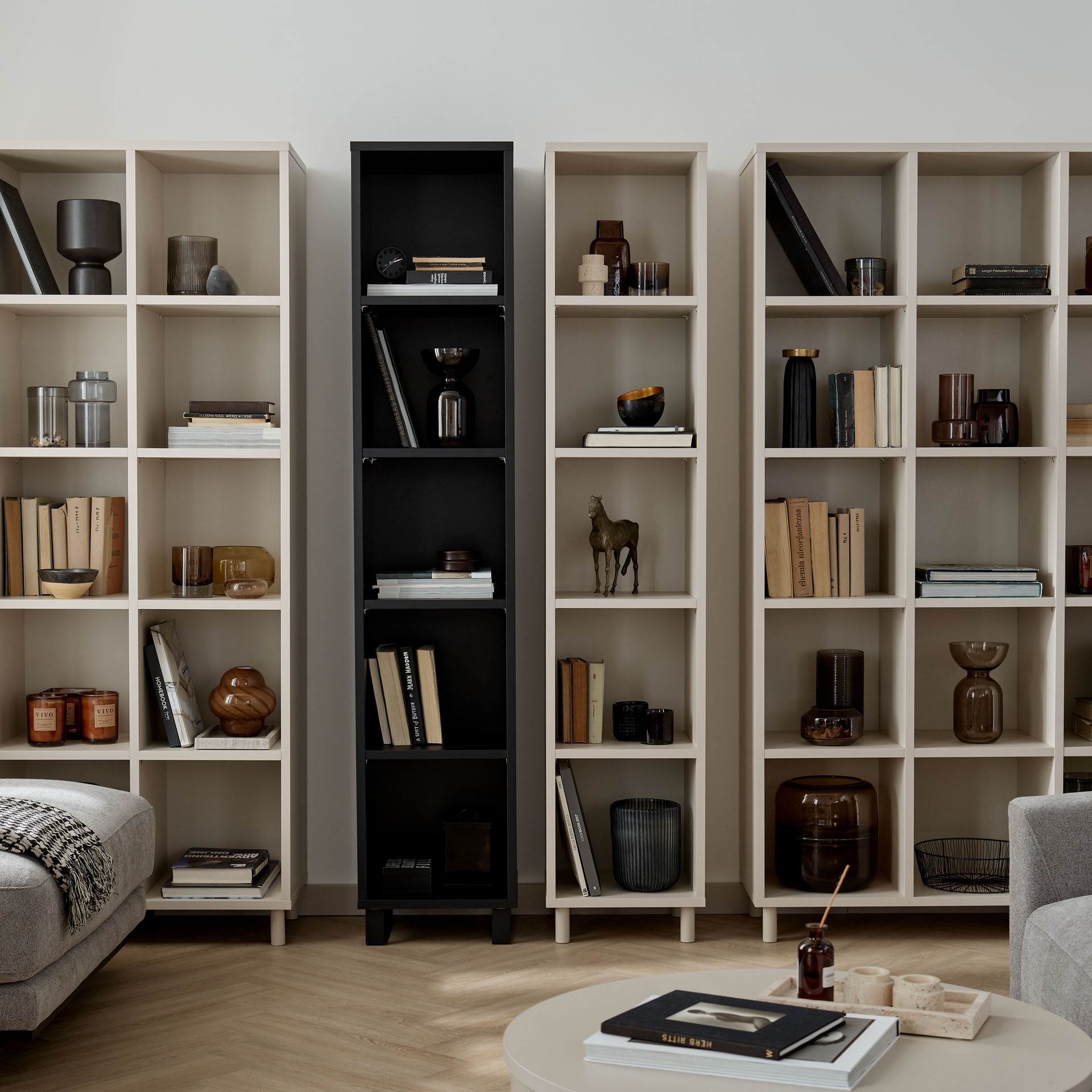 - Pojedynczy regał możesz zestawić z innymi otwartymi regałami z kolekcji Simple, tworząc spójną kompozycję. Do wyboru masz regał podwójny (2x5), regał szeroki (4x5) oraz regał niski (3x4). Dostępny jest także wąski regał w zamykanej wersji.