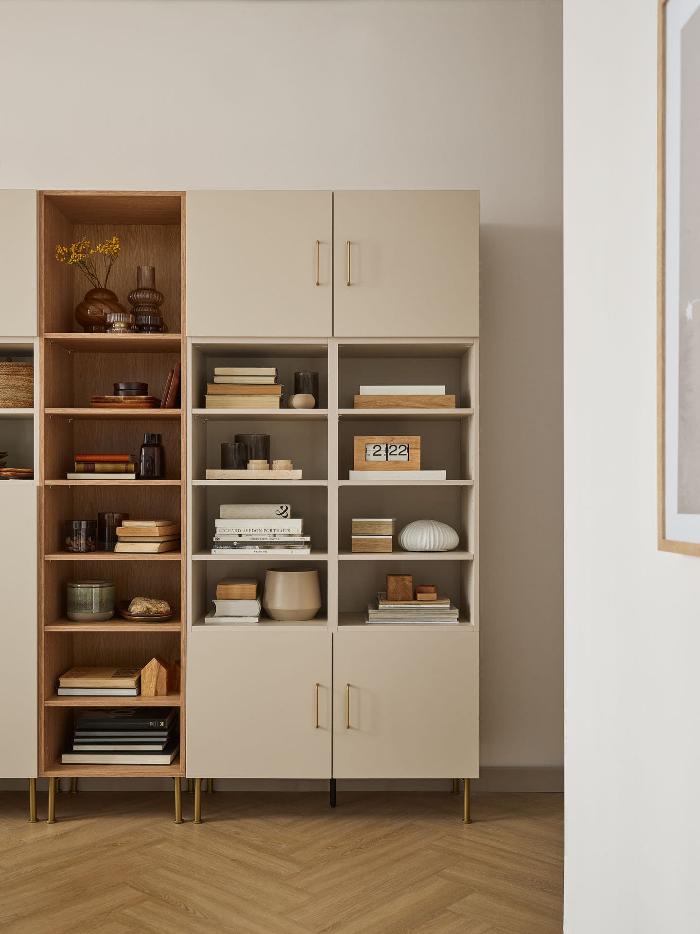 - Półki podwójnego regału możesz zostawić otwarte lub dobrać do nich fronty w 4 różnych rozmiarach (pojedyncze lub podwójne). Wszystkie posiadają system cichego domykania (wyjątkiem jest wybór systemu Push to open, który uniemożliwia zastosowanie cichego domykania).