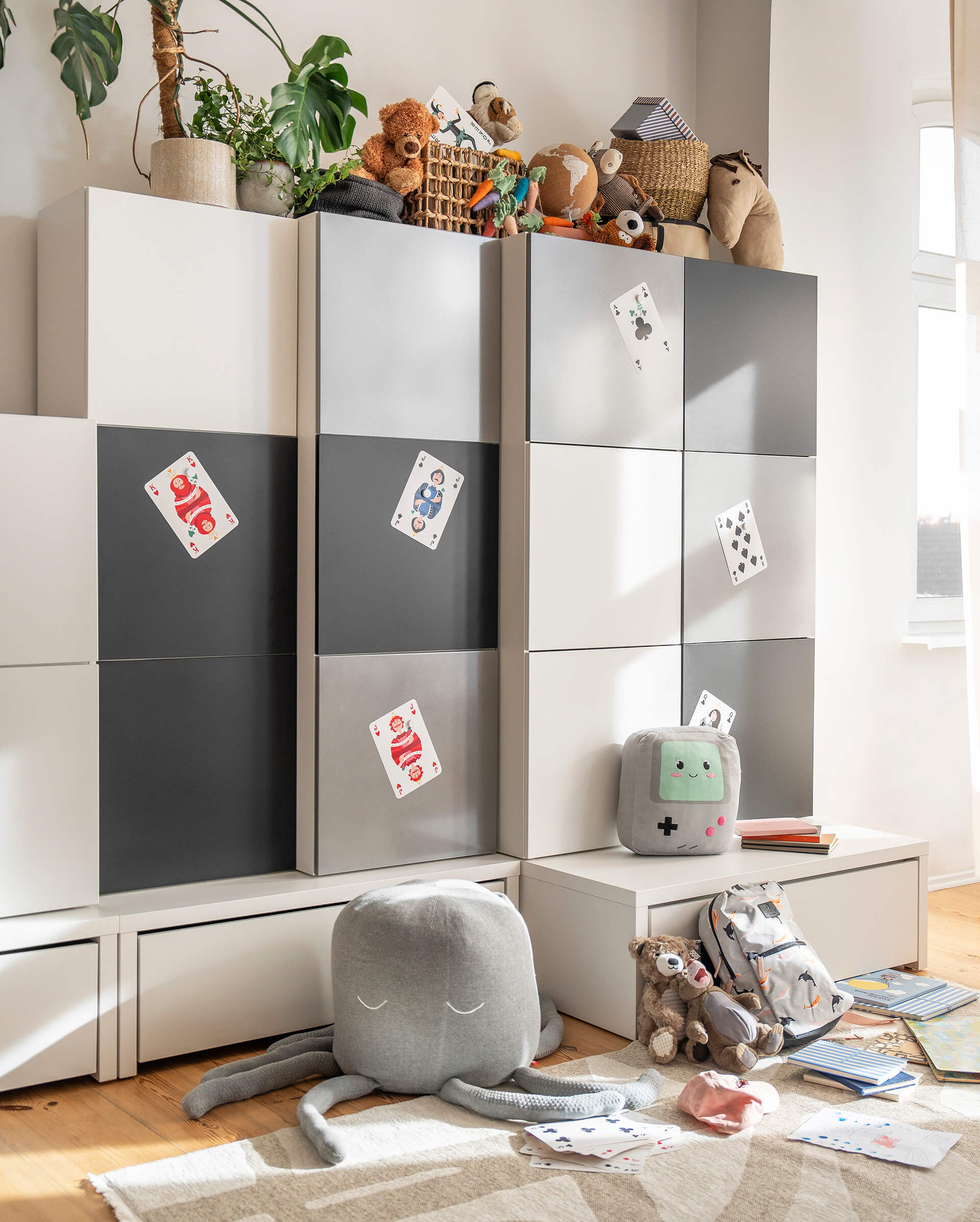 - Na frontach można zamontować metalowe nakładki i nadać uniwersalnemu meblowi określony sznyt. Pełnią one nie tylko funkcję dekoracyjną, ale również praktyczną. Można przyczepiać do nich magnesy, robić na nich notatki, rysować, a nawet grać w proste gry.
