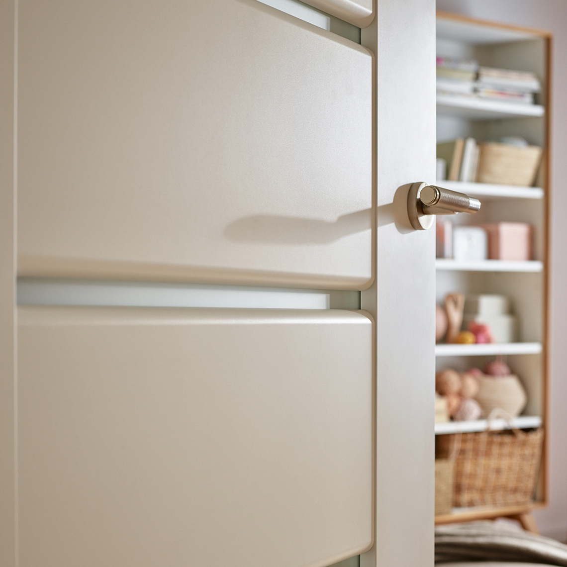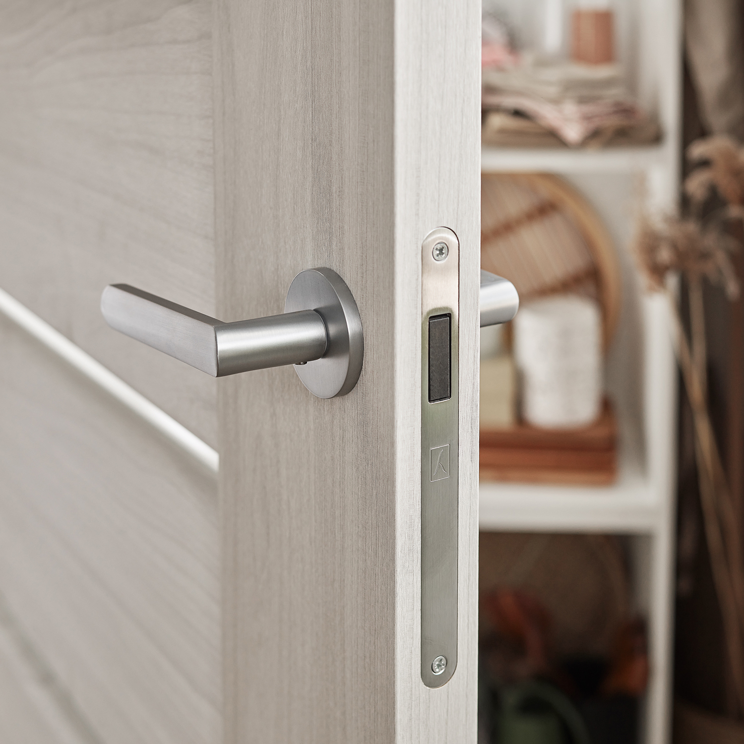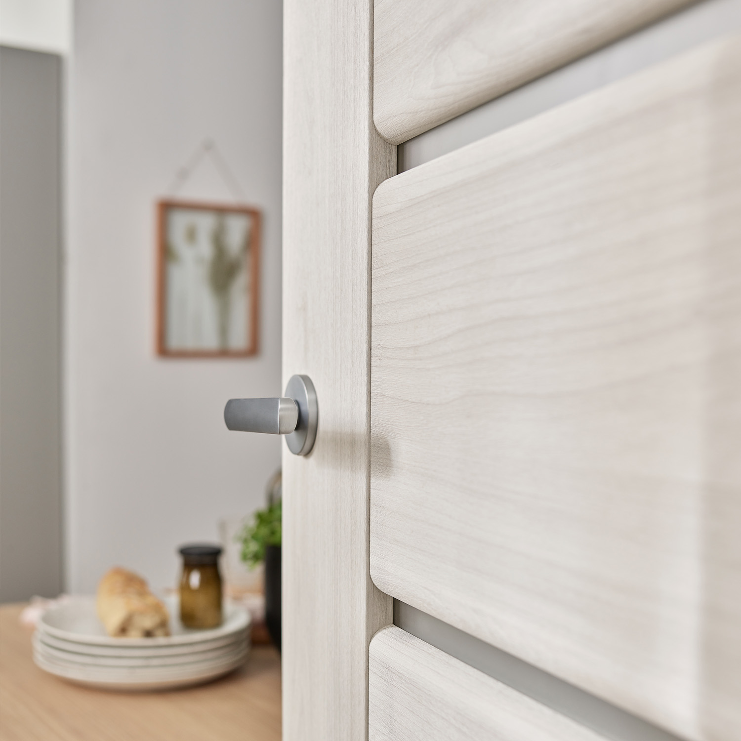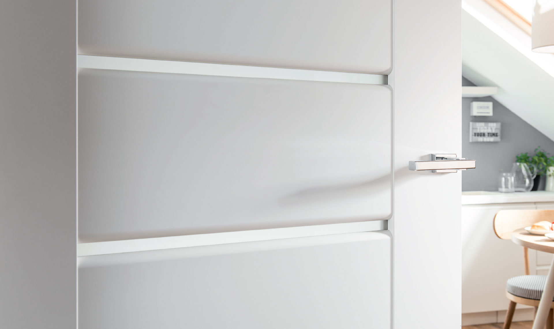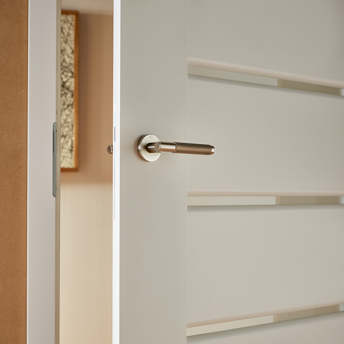 - Bezprzylgowa z krawędzią bez przylgi oraz 2 zawiasami chowanymi Estetic 80 (zawiasy stanowią wyposażenie dedykowanej ościeżnicy). W wersji bezprzylgowej zamek magnetyczny na klucz zwykły, blokadę łazienkową, wkładkę patentową lub zamek oszczędnościowy.