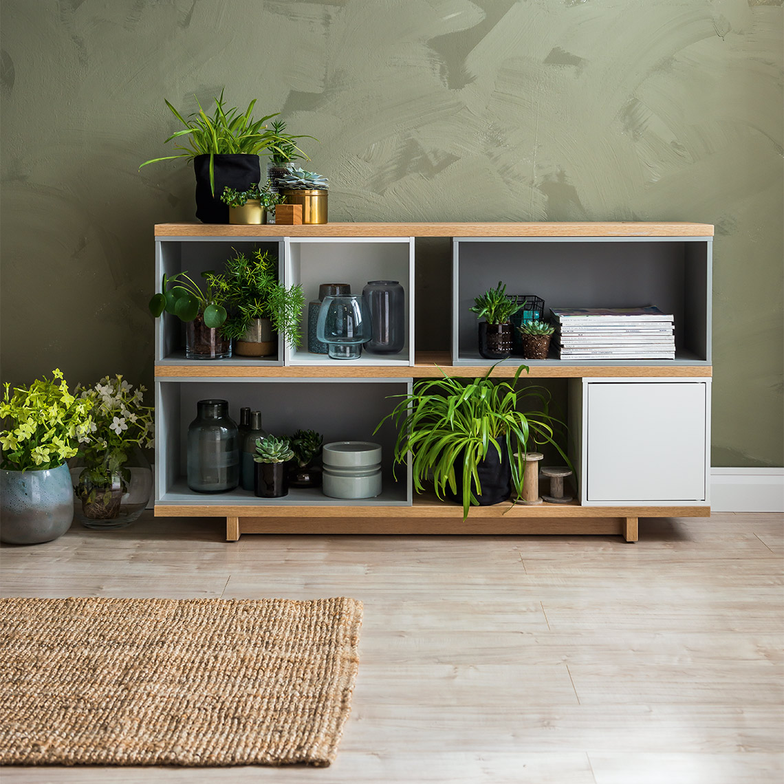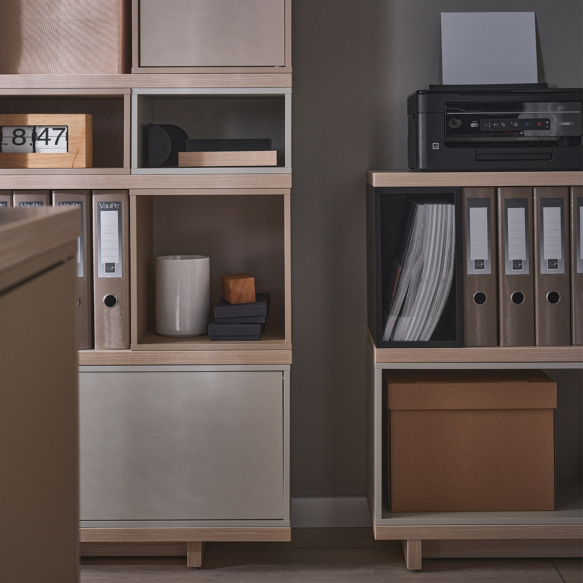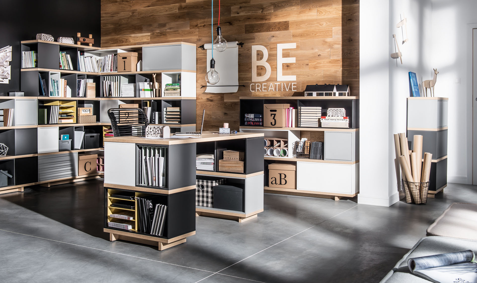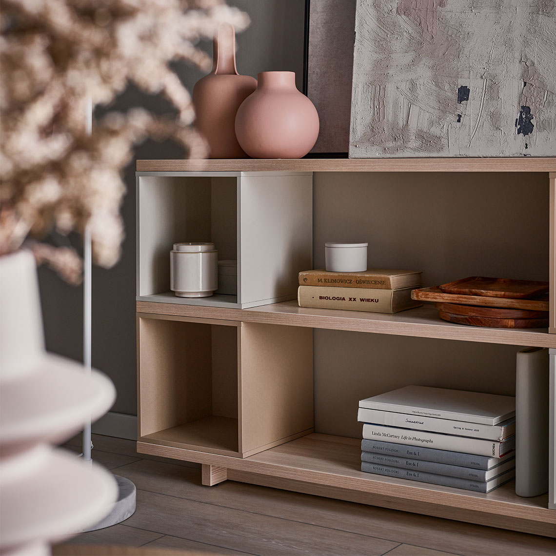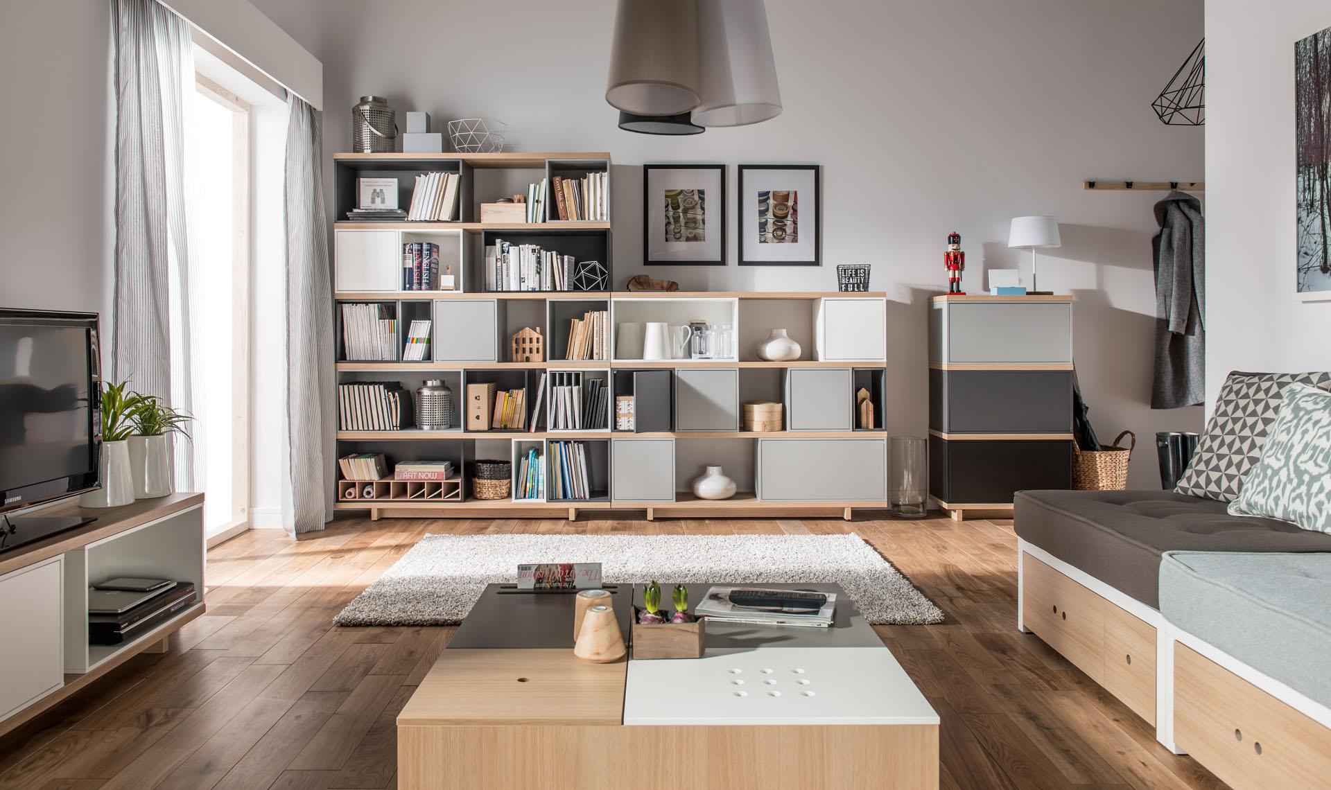 - Tworzenie własnego mebla jest bardzo proste: należy wybrać półkę z cokołem: dużą lub małą. Ustawić na niej min. dwie skrzynki (do wyboru 5 typów) i nałożyć półkę takiej samej długości, jak półka z cokołem. Operację powtarzamy, aż uzyskamy docelowy mebel.