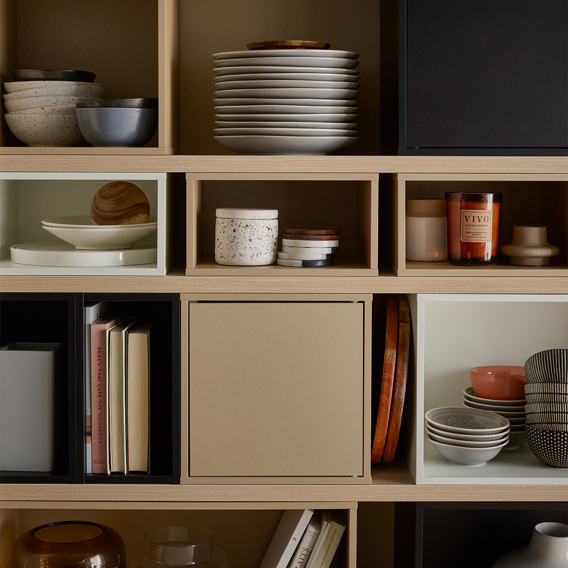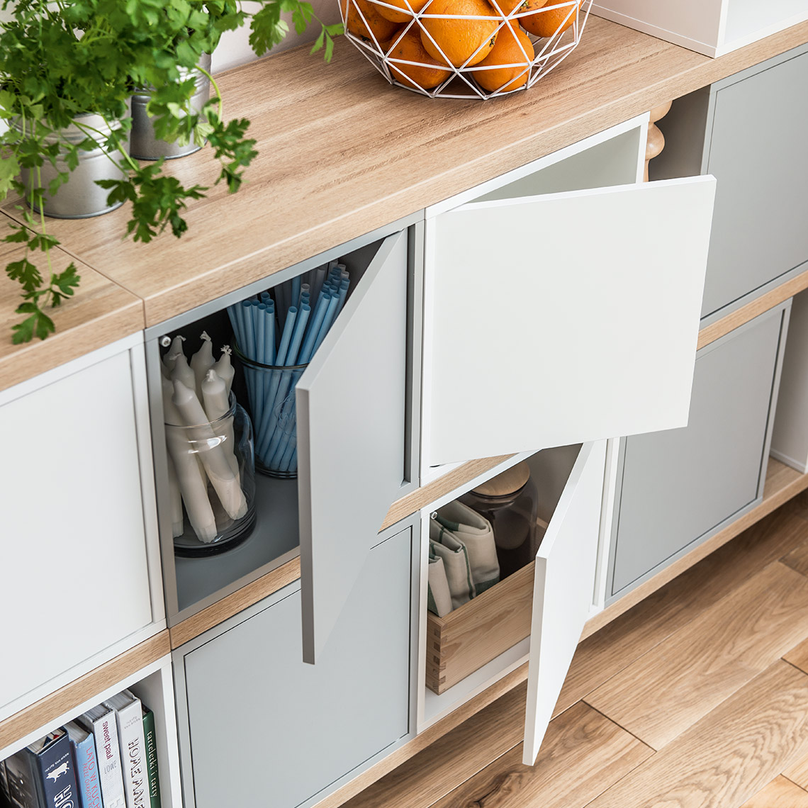 - Tworzenie własnego mebla jest bardzo proste: należy wybrać półkę z cokołem: dużą lub małą. Ustawić na niej min. dwie skrzynki (do wyboru 5 typów) i nałożyć półkę takiej samej długości, jak półka z cokołem. Operację powtarzamy, aż uzyskamy docelowy mebel.