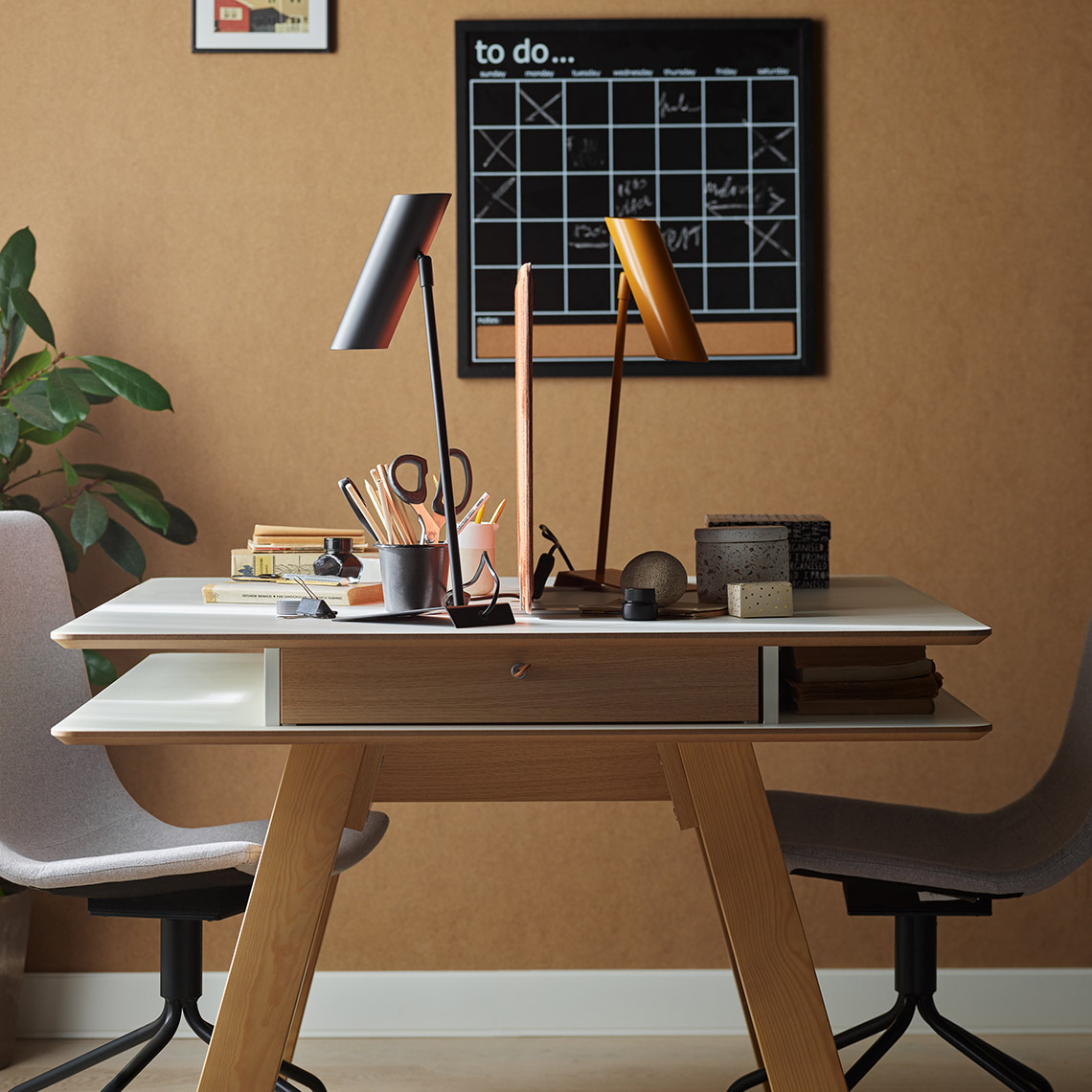 - We wnęce blatu znajduje się też otwór na przełożenie kabli. Możesz wykorzystać go na ładowarkę do laptopa, kiedy pracujesz przy stole.