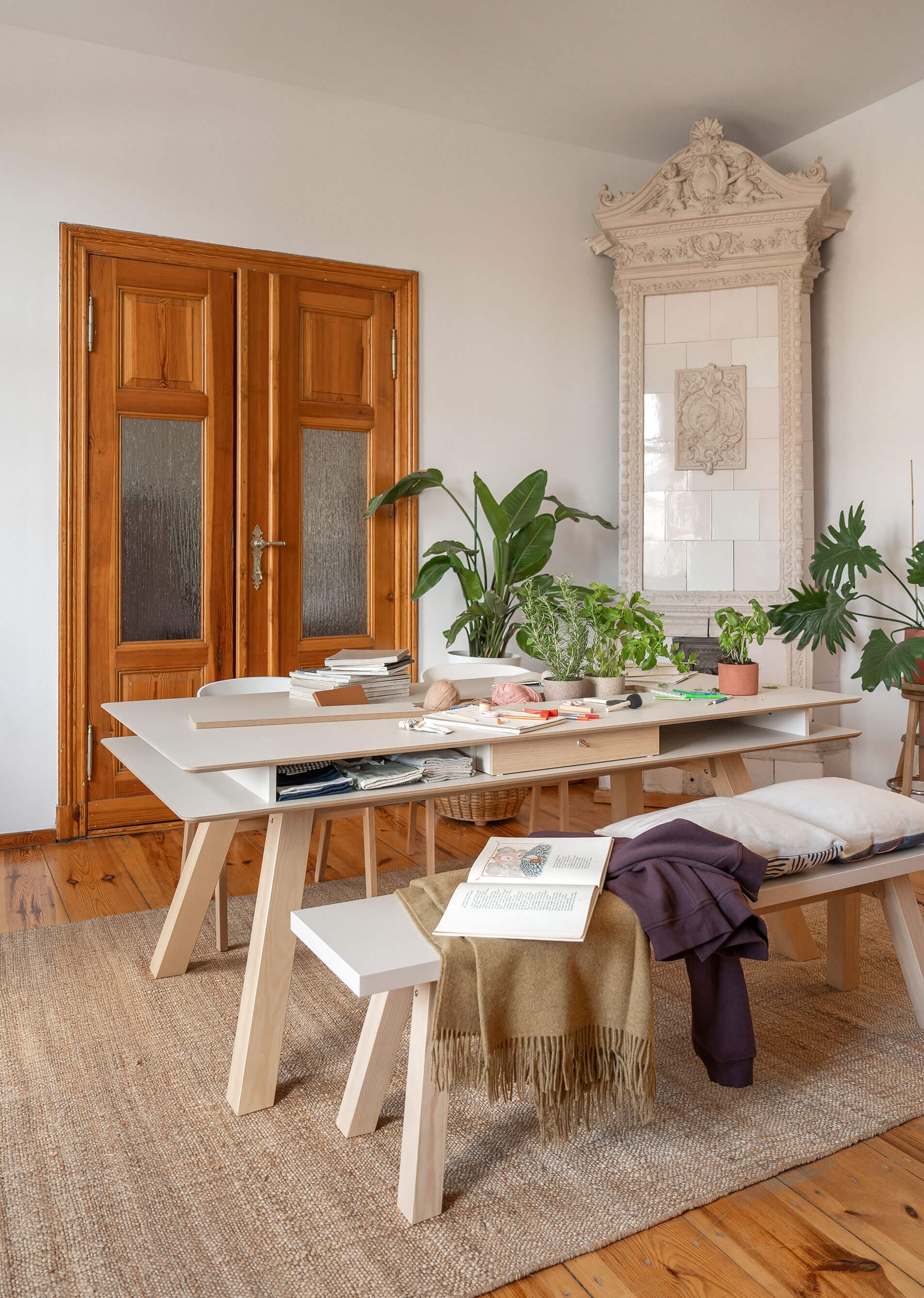 - Przestrzeń między dwoma blatami stołu to idealne miejsce na przechowywanie drobnych przedmiotów. To, co chce się ukryć, można schować w kupowanych osobno pojemnych szufladach. W stole zmieści się ich aż 6.
