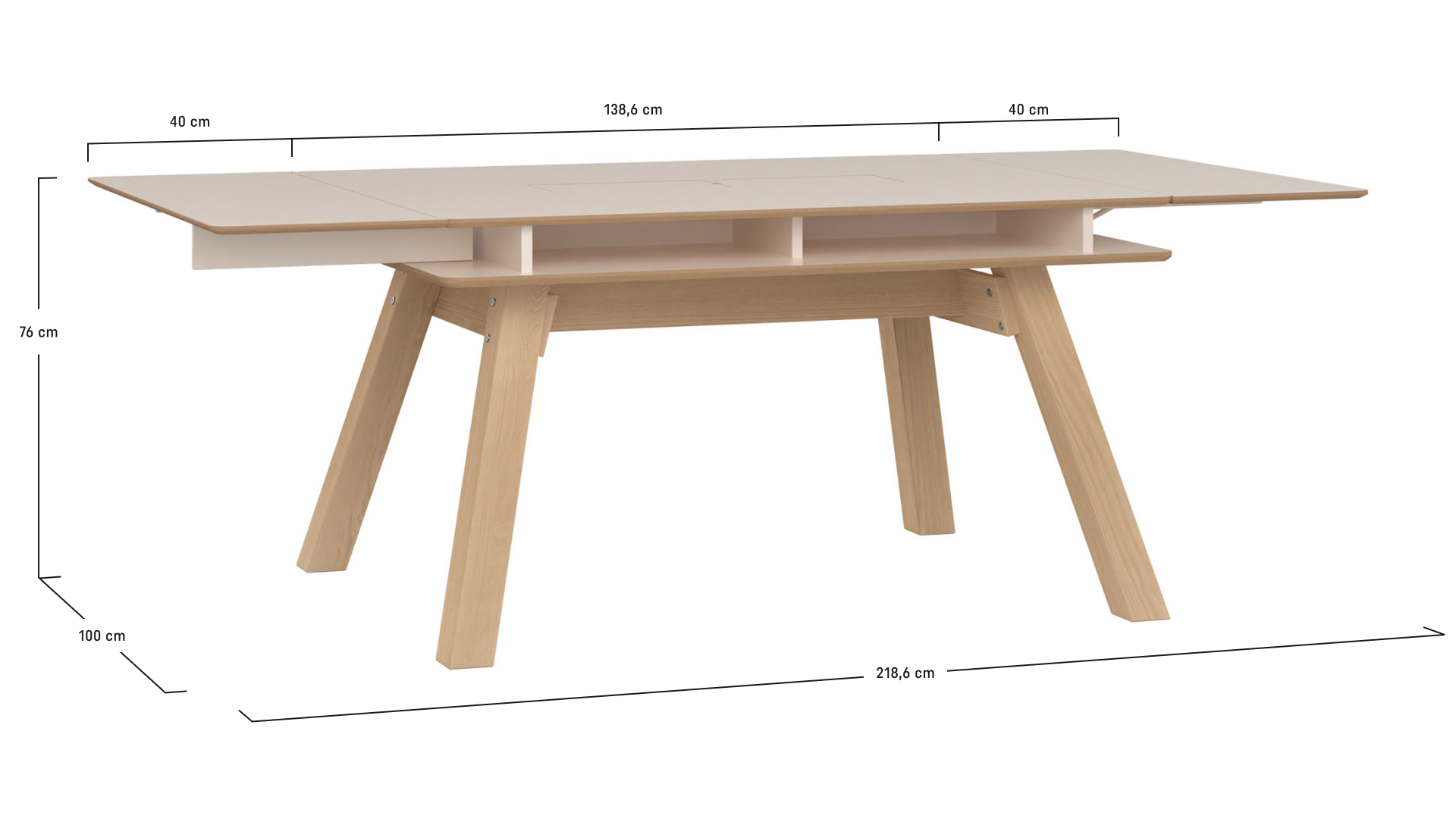 - Stół wyposażony jest w wysuwane oddzielnie wkładki o szerokości 40 cm każda. Elementy są w komplecie ze stołem i można je wykorzystać w celu powiększenia powierzchni blatu – po ich wysunięciu całkowita długość mebla wyniesie 220 cm.