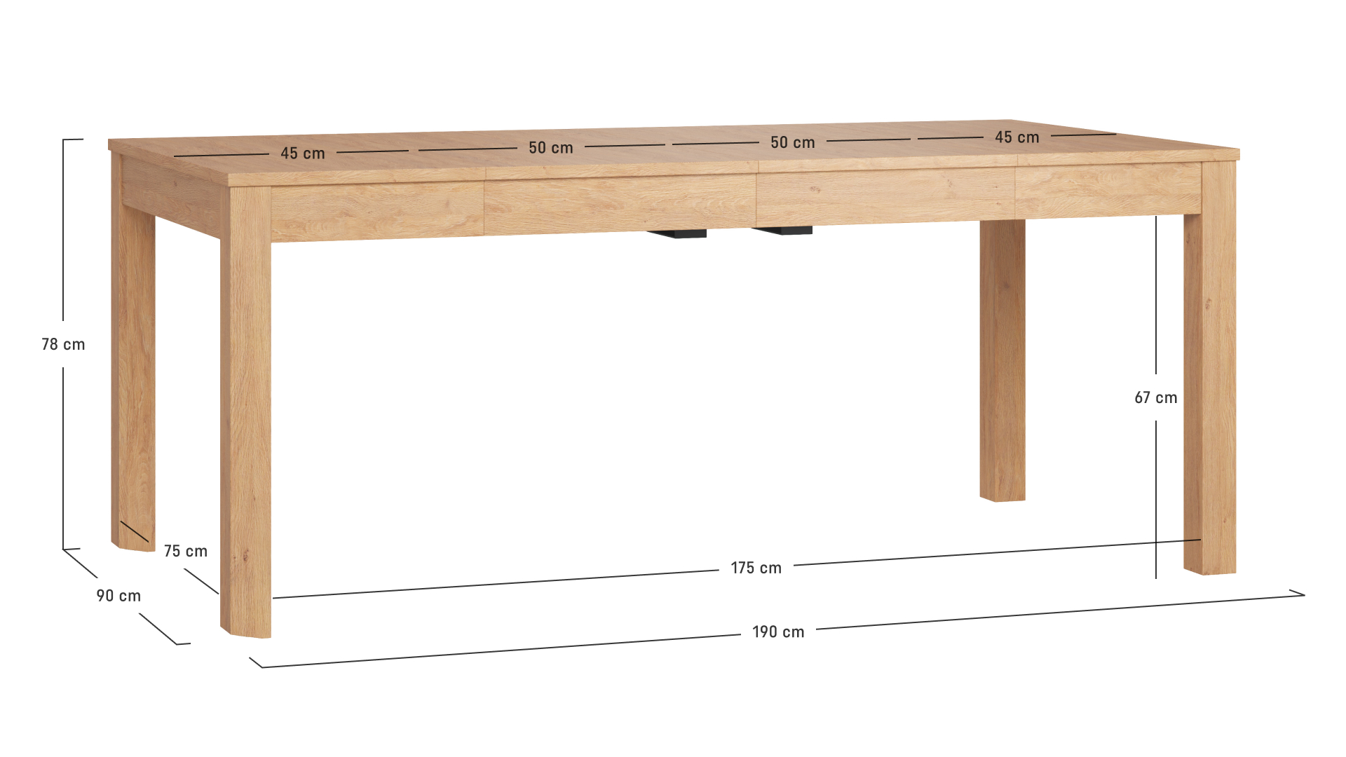 - Blat można przedłużać dwoma wkładkami o szerokości 50 cm. Przemyślana konstrukcja stołu pozwala na ich wygodne przechowywanie w meblu.