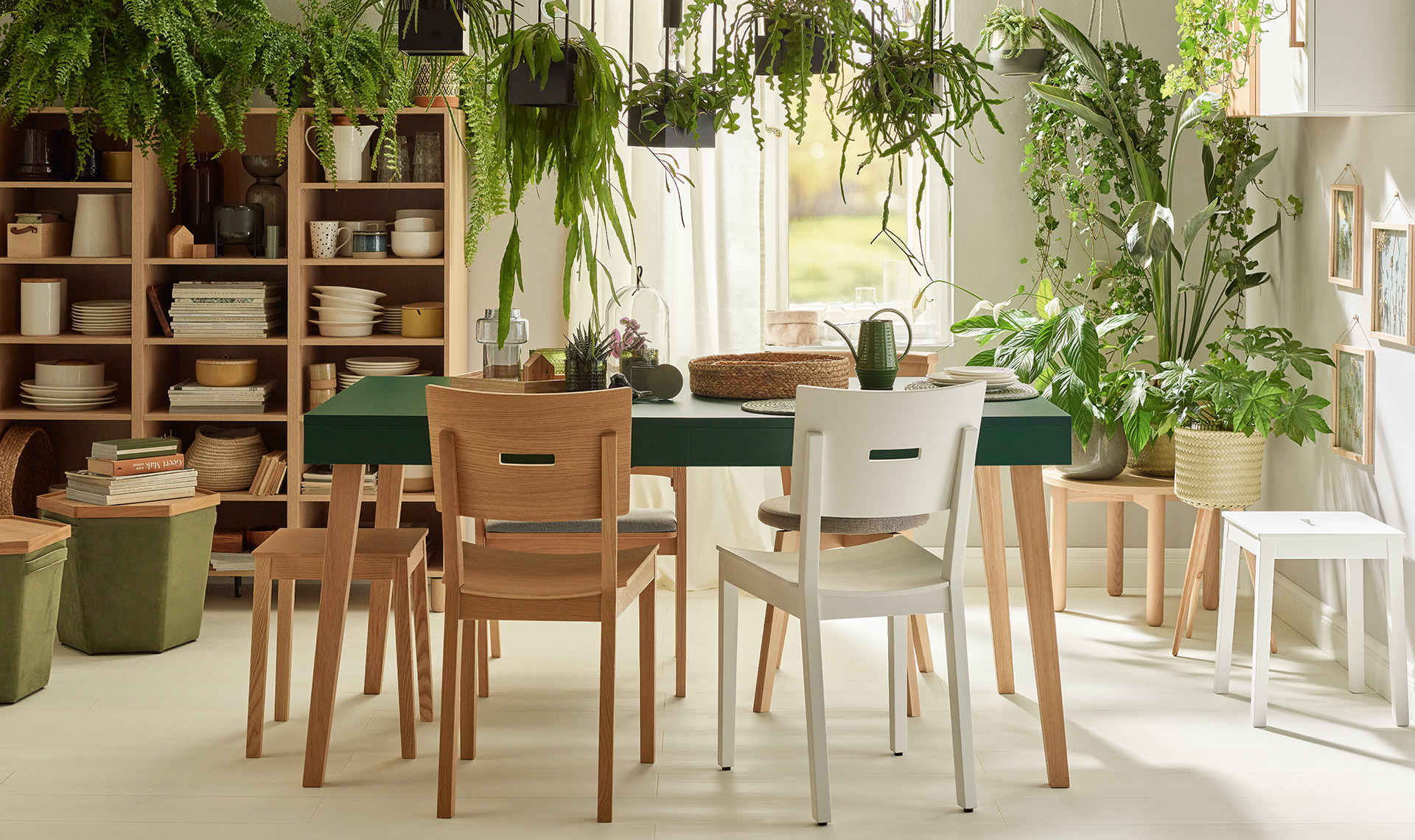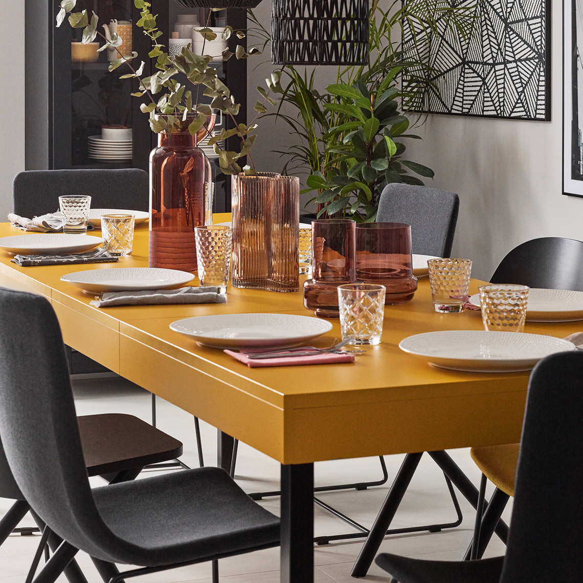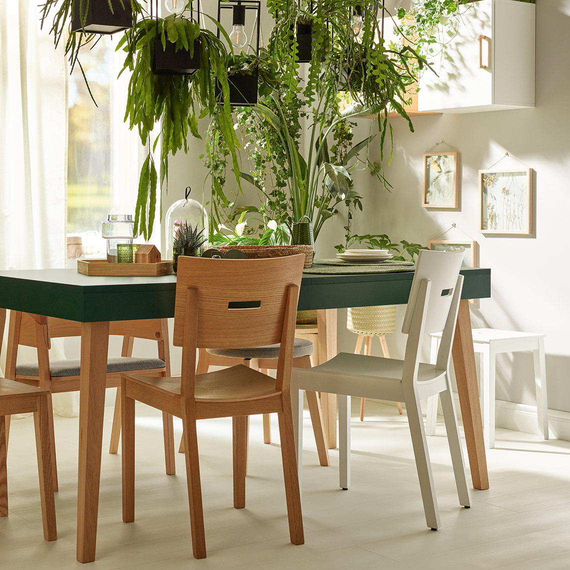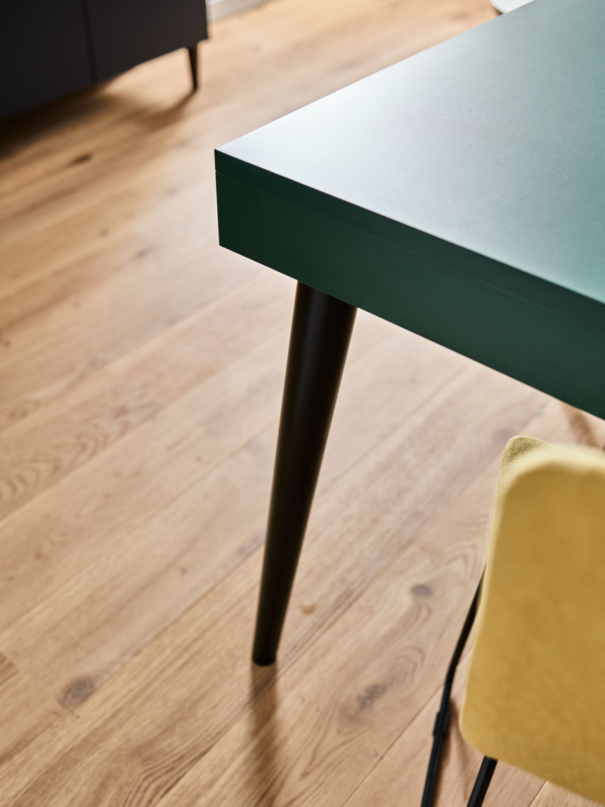 - Skomponuj swój stół od zera lub wybierz jeden z gotowych projektów. Blat o odcieniu brązowego dębu na metalowych płozach, biały stół ze skośnymi nogami lub intensywnie zielony blat ze stożkowatymi nogami – to tylko kilka z możliwych wariantów, które możesz w pełni modyfikować.