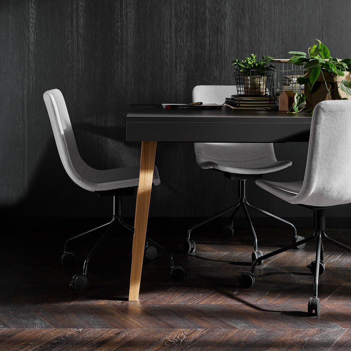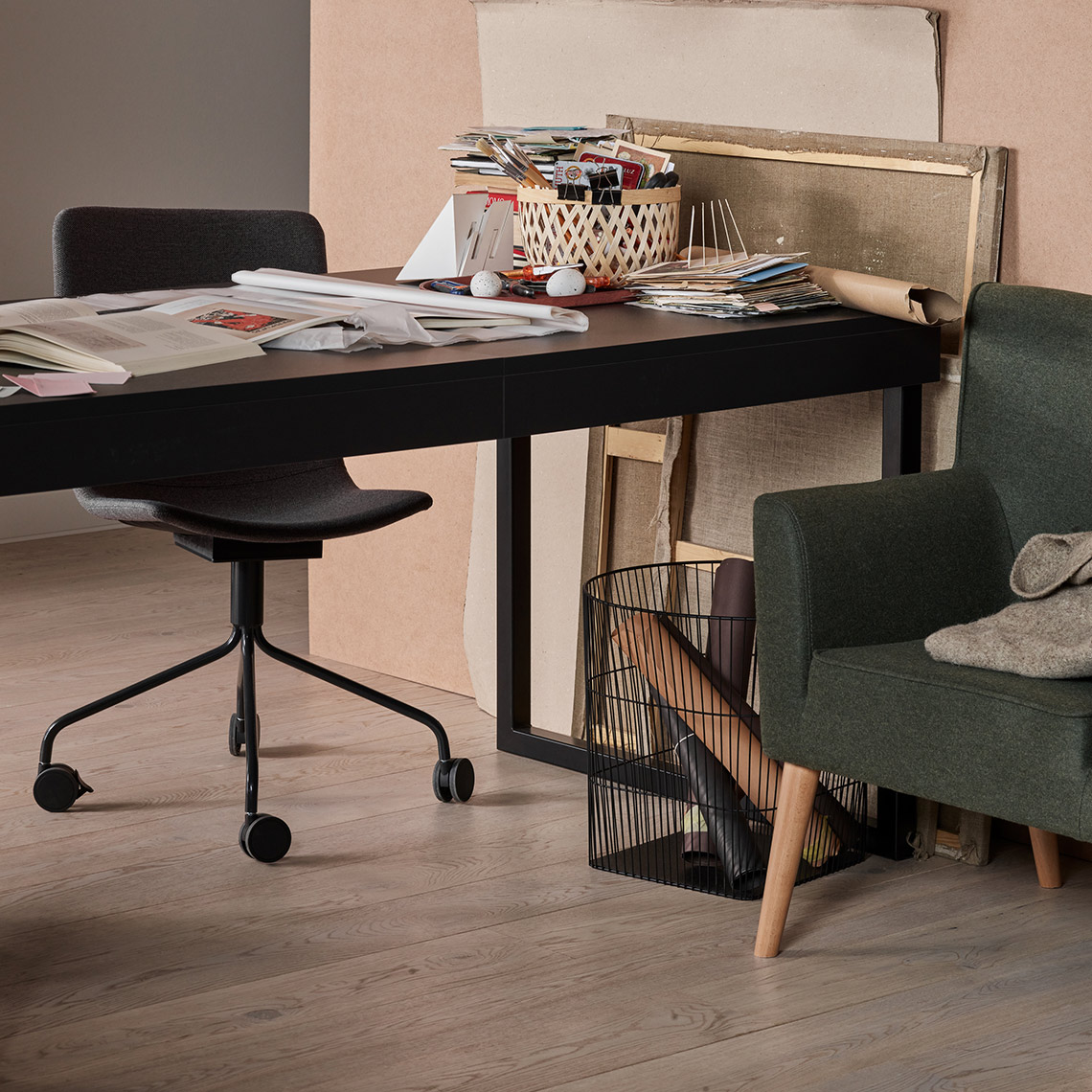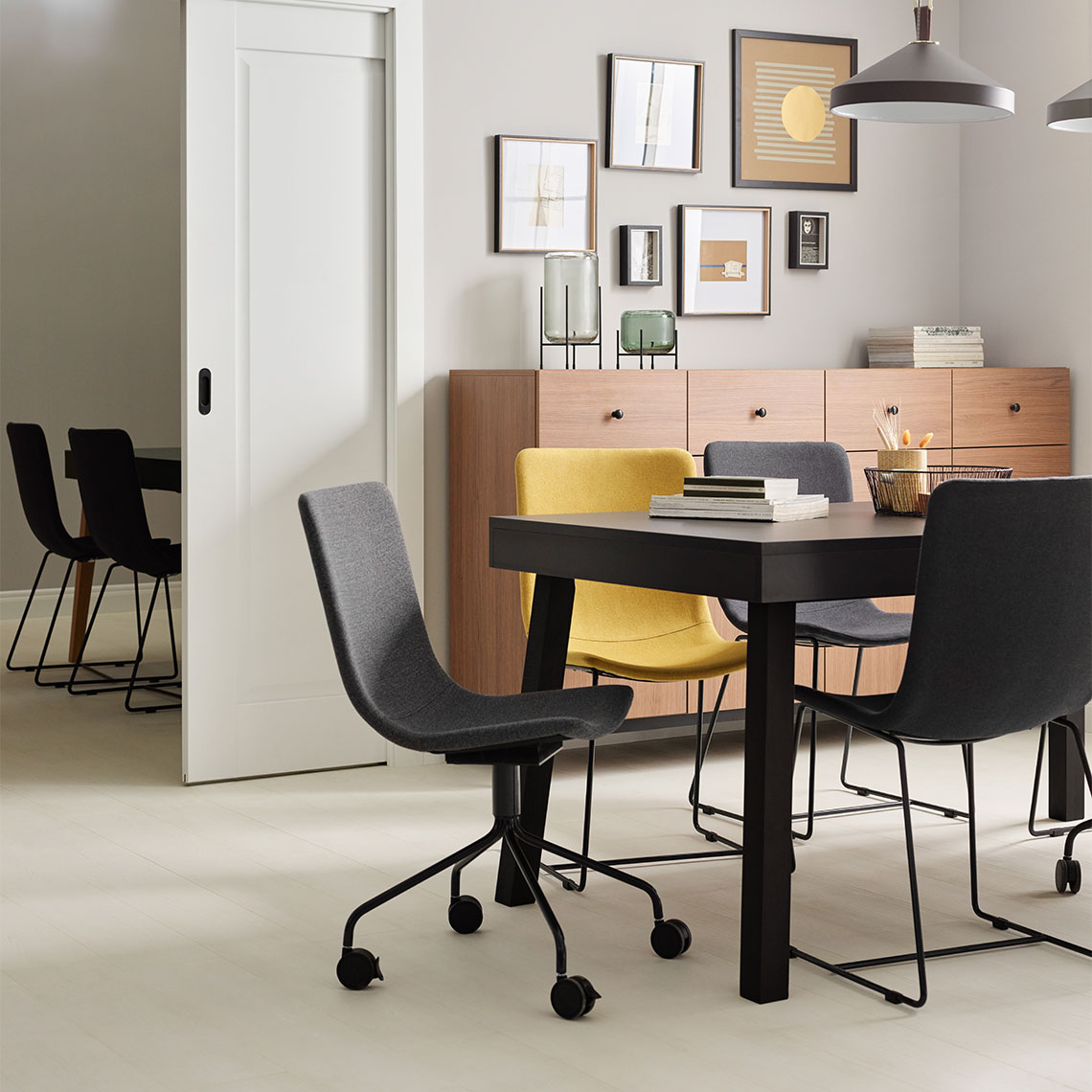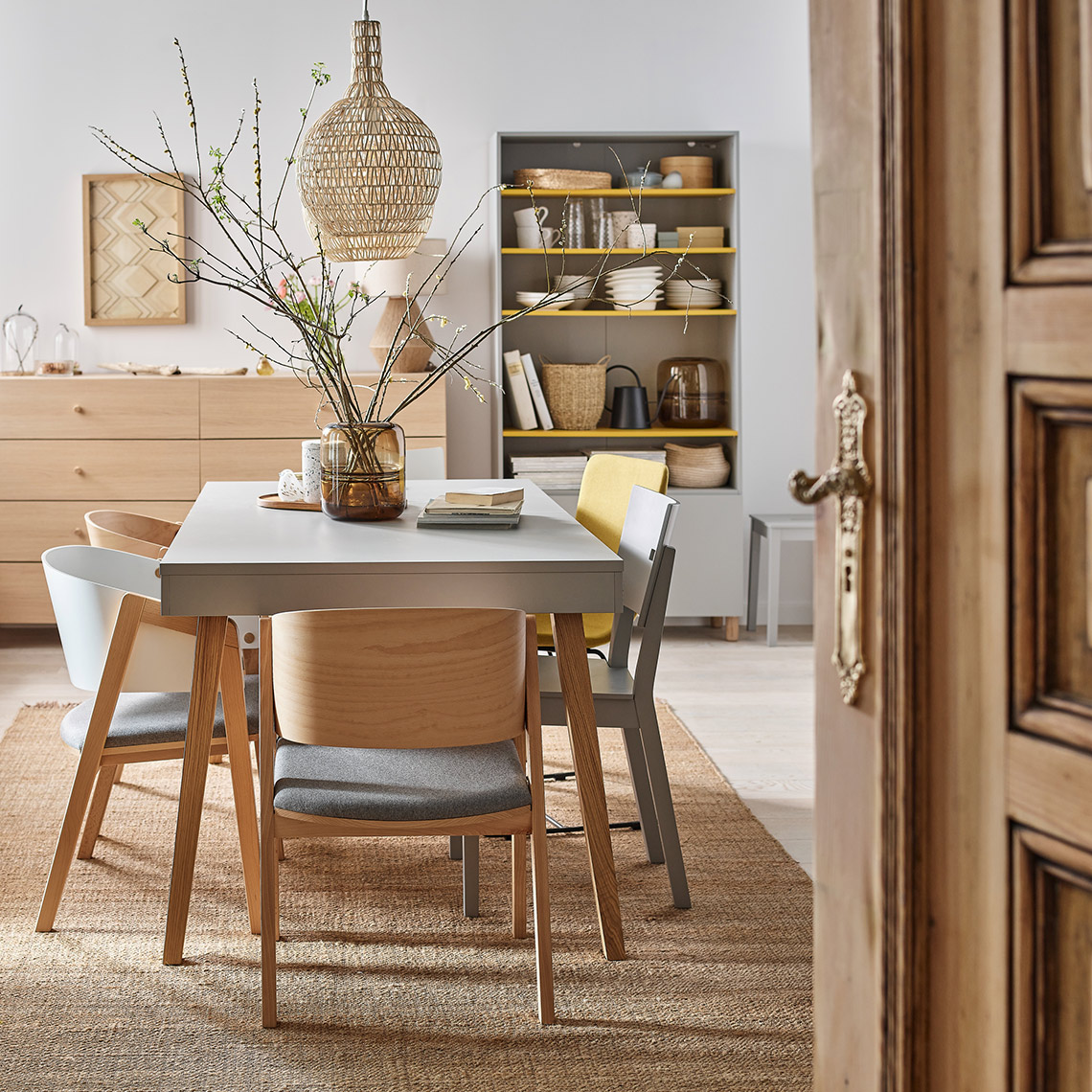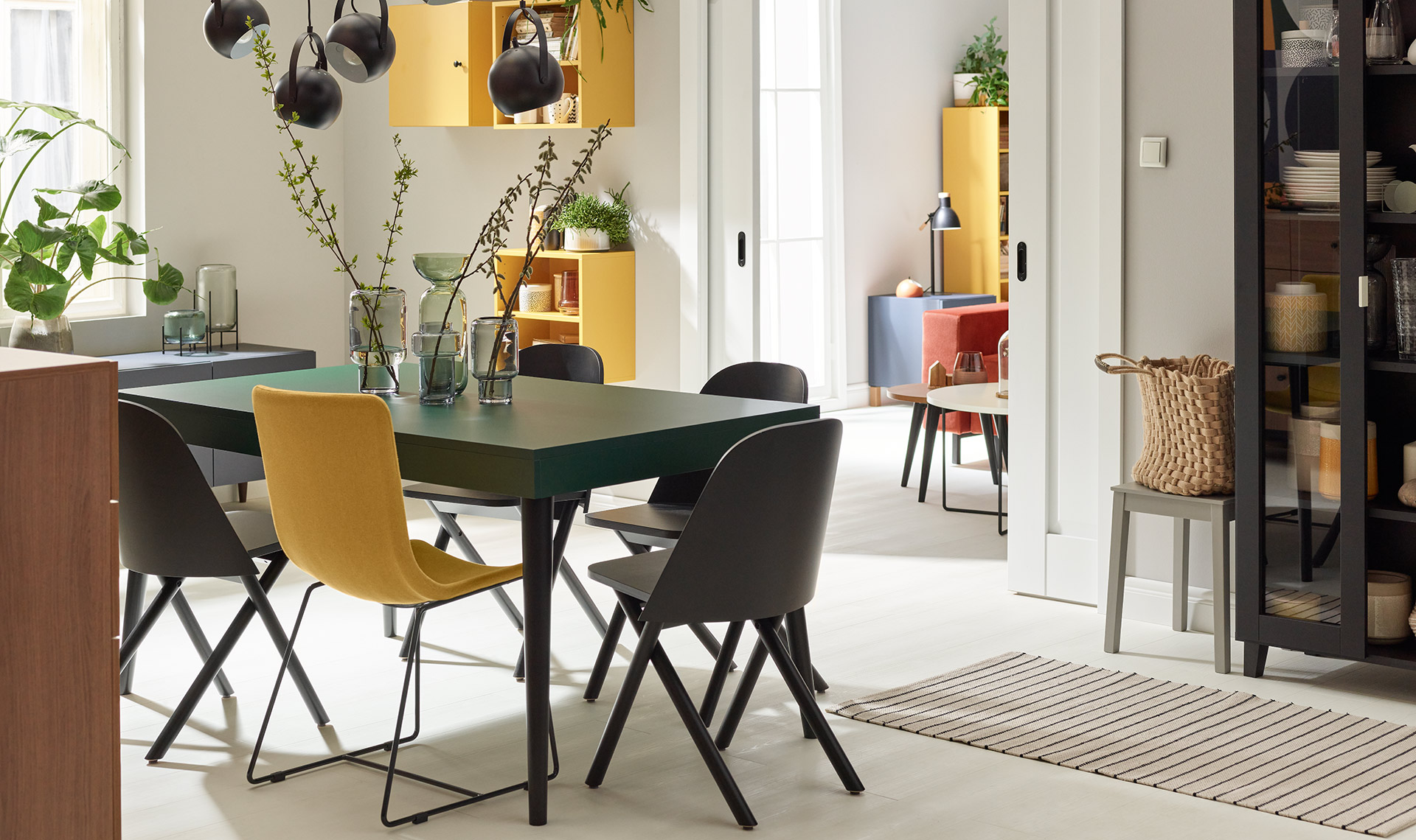 - Skomponuj swój stół od zera lub wybierz jeden z gotowych projektów. Blat o odcieniu brązowego dębu na metalowych płozach, biały stół ze skośnymi nogami lub intensywnie zielony blat ze stożkowatymi nogami – to tylko kilka z możliwych wariantów, które możesz w pełni modyfikować.