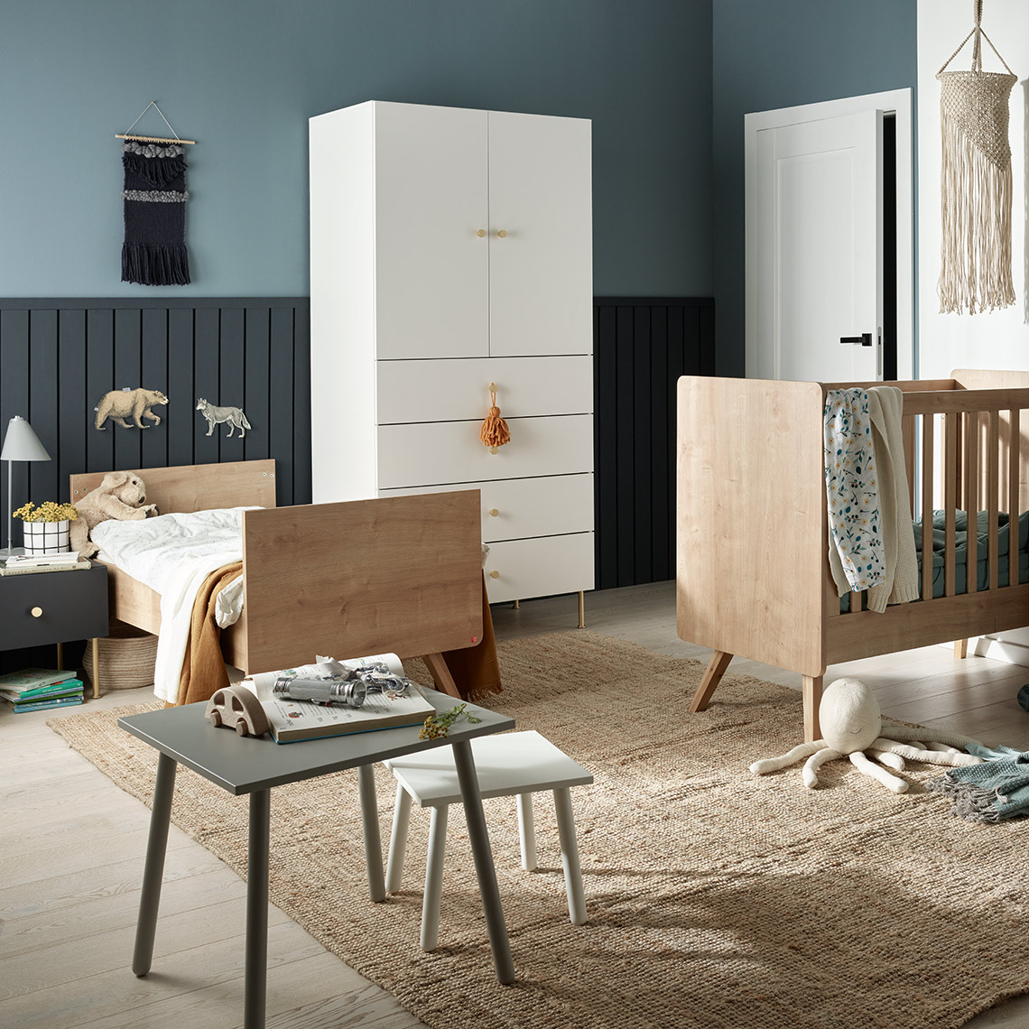 Stolik dziecięcy Match jest dostępny w 3 kolorach do wyboru: białym, dębowym i szarym.