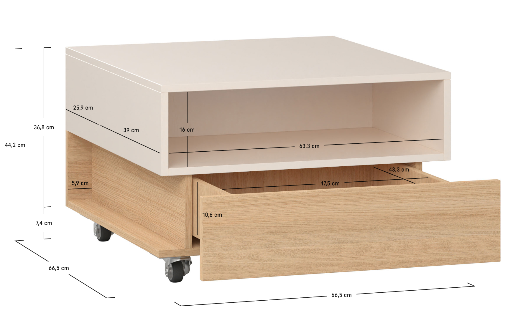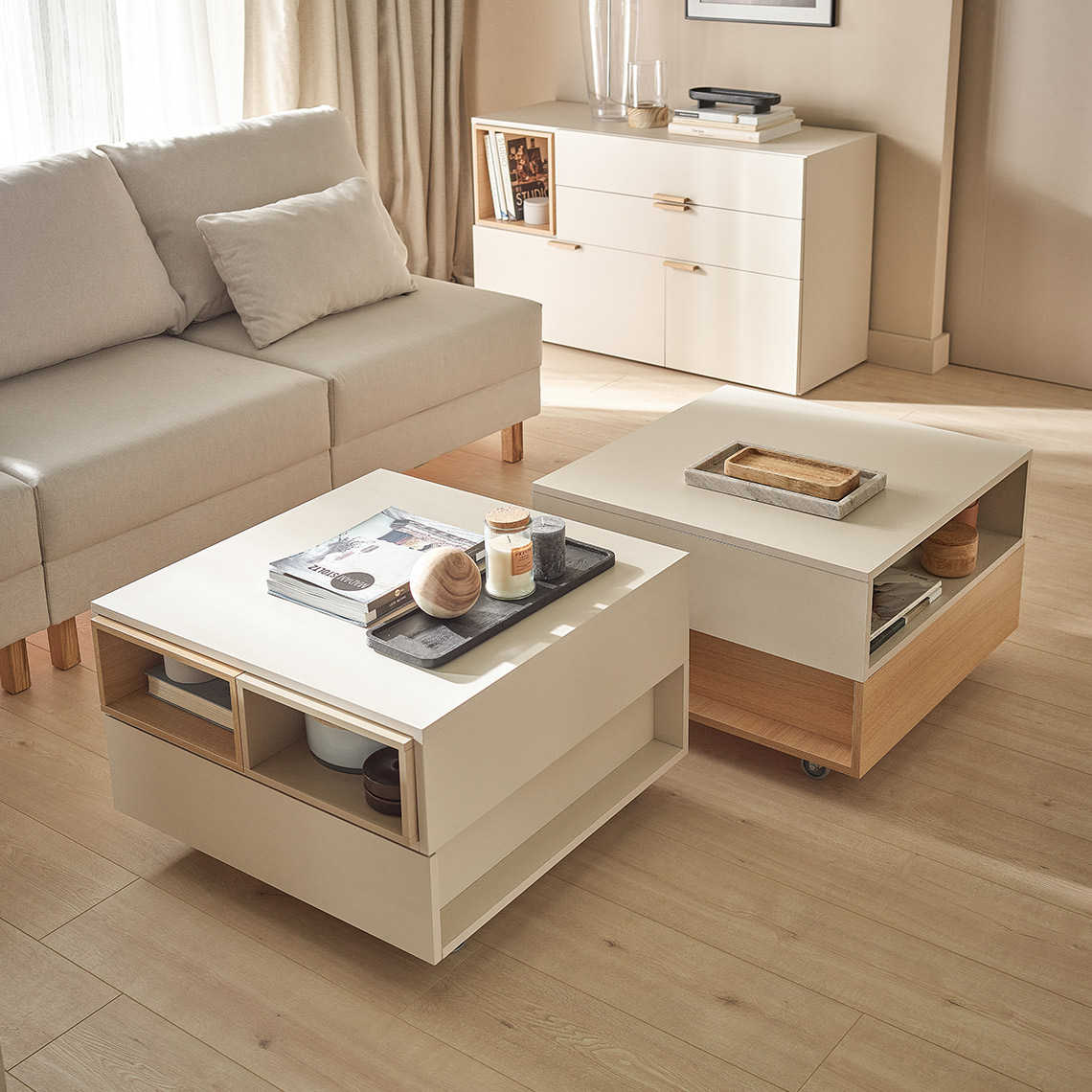 - Niewielki kwadratowy stolik kawowy przyjmuje formę przestrzennej kostki z dodatkową wnęką i praktyczną szufladą – zlokalizowana w dolnej części stolika, pozwala ukryć wiele drobiazgów i zaprowadzić wśród nich porządek. Uchwyty zostały dyskretnie wkomponowane po bokach. Dzięki prowadnicom z systemem cichego domykania jej użytkowanie jest wygodne i ciche. Wystarczy delikatnie pchnąć szufladę, by domknęła się sama.