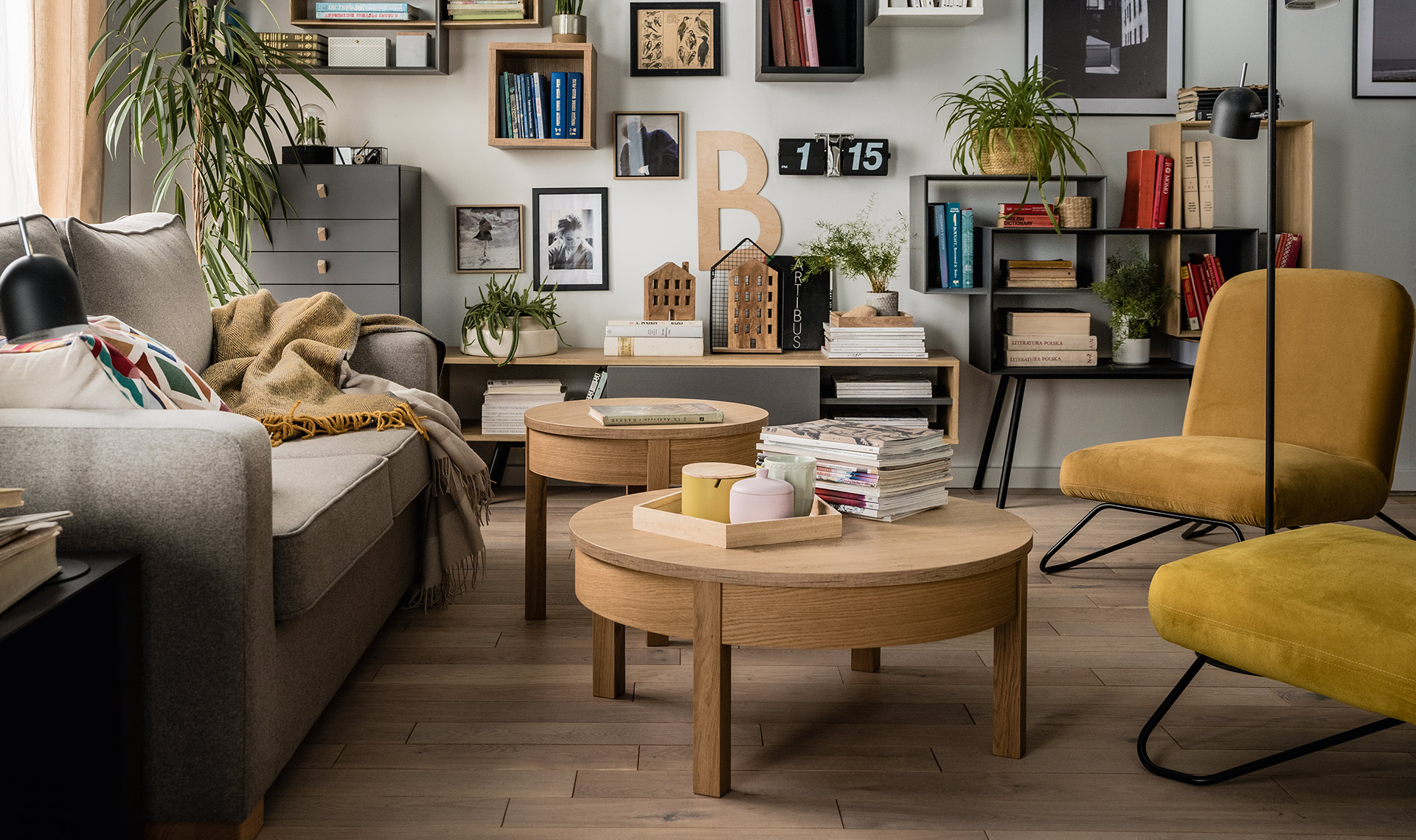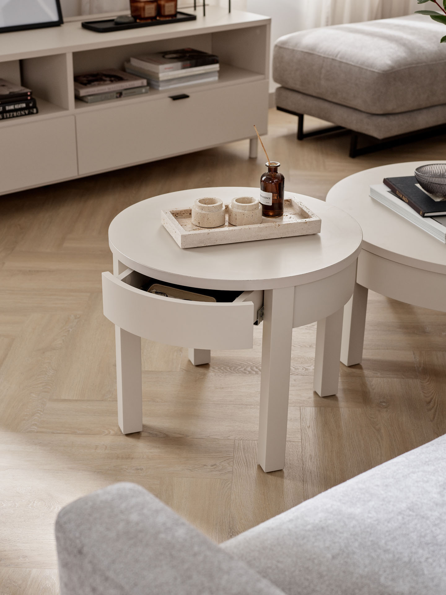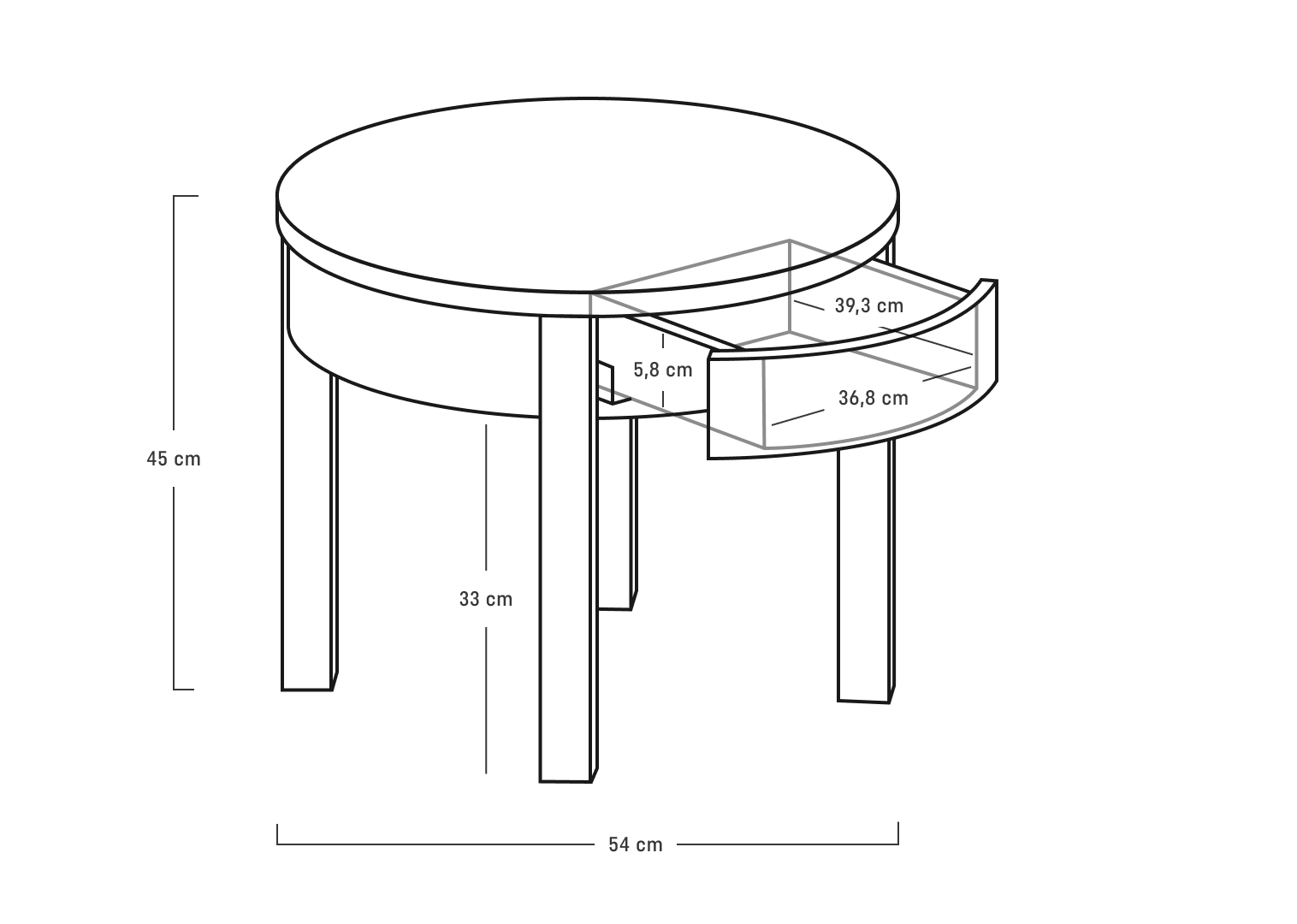 Na wysoki stolik kawowy Simple znajdzie się miejsce w każdym wnętrzu. Mebel o średnicy 45 cm może pełnić wiele funkcji, zgodnie z aktualnymi potrzebami. Pod okrągłym blatem znajdziesz małą szufladkę do przechowywania podręcznych przedmiotów.