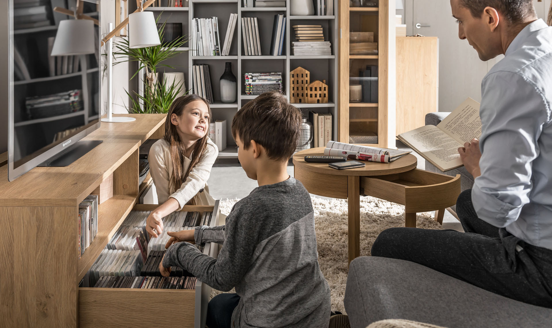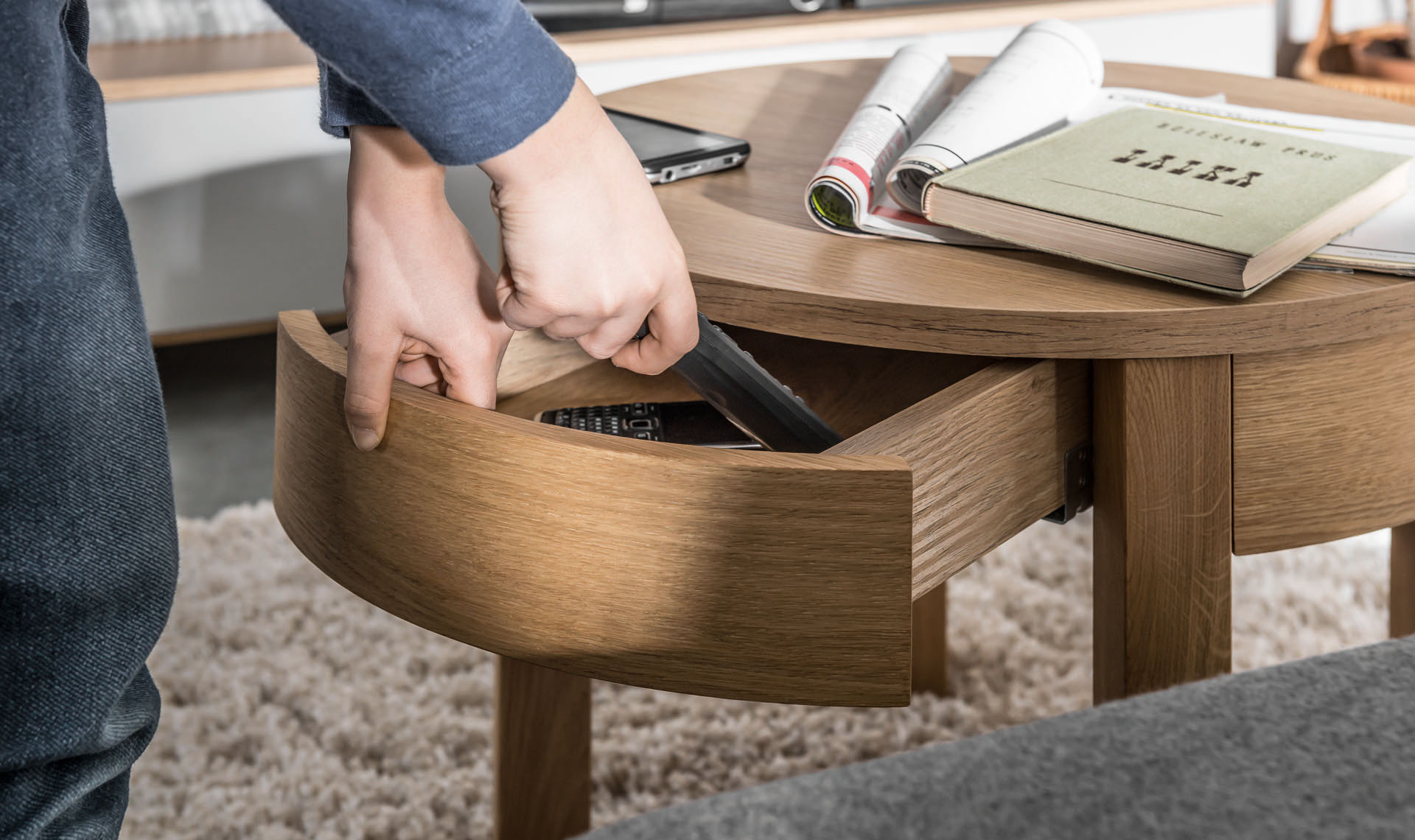 - Mebel może służyć jako przybornik na drobiazgi przy meblach wypoczynkowych. Ukryty schowek pomieści okulary, ładowarkę czy pilot od telewizora.