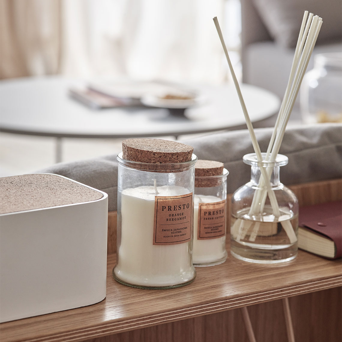 Świeca Presto wyczaruje przyjemną atmosferę we wnętrzu i wprowadzi Cię w dobry nastrój. Egzotyczny zapach pomarańczy bergamotki rozpieszcza zmysły, sprzyjając odprężeniu. Subtelny aromat jest zasługą sojowego wosku, dzięki któremu świeca pali się równomiernie i nie wydziela toksycznych substancji. Po wypaleniu świecy duży szklany słoik z korkowym wieczkiem wykorzystasz jako lampion na tealighty lub pojemnik na drobiazgi.