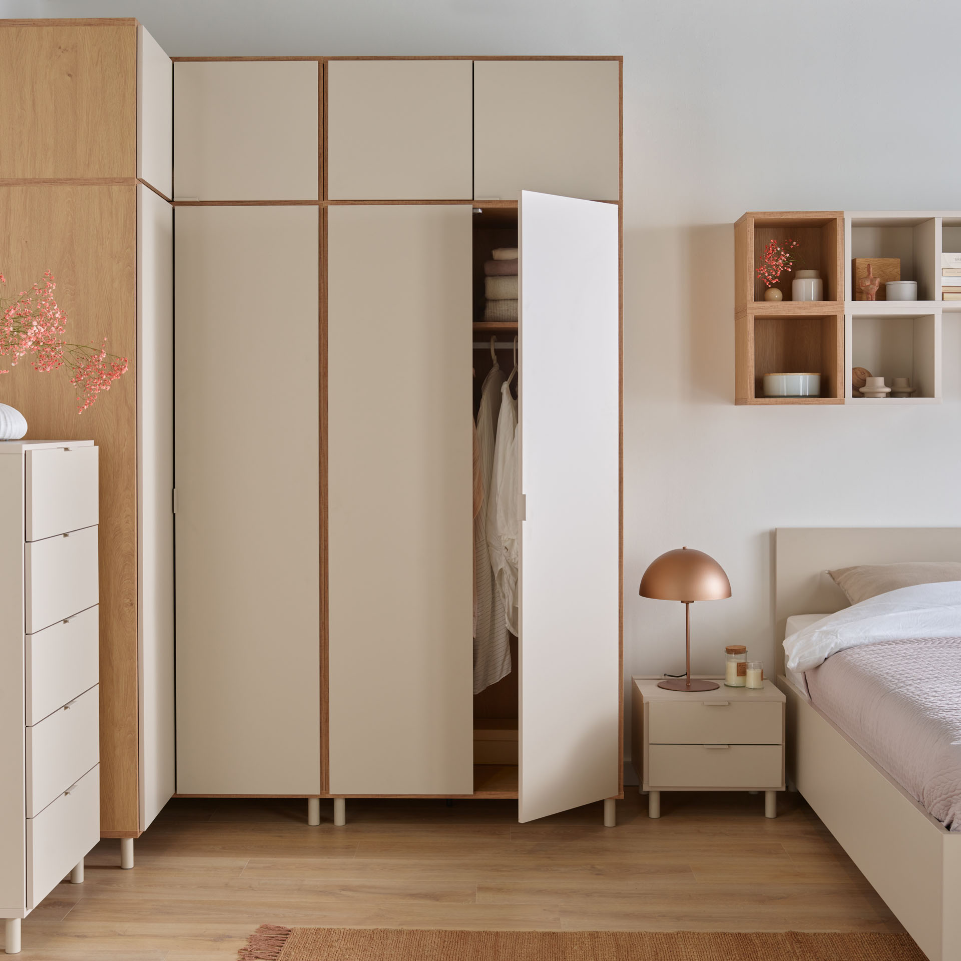 - Jeśli zapragniesz zmienić wnętrze szafy, w każdej chwili możesz przełożyć półki oraz drążek w inne miejsce. Opcjonalnie można także dokupić nadstawkę szafy 2-drzwiowej, tak by zwiększyć powierzchnię przechowywania mebla.