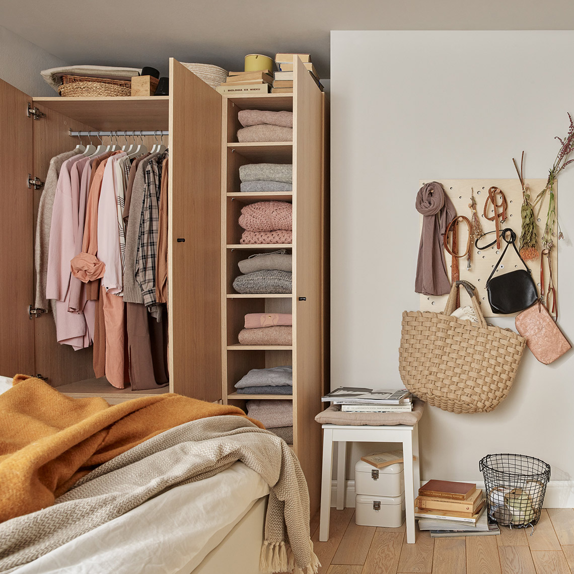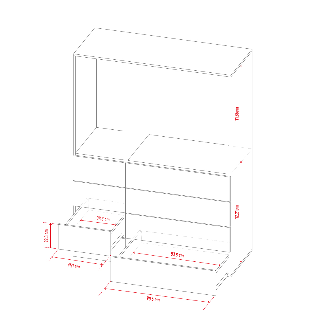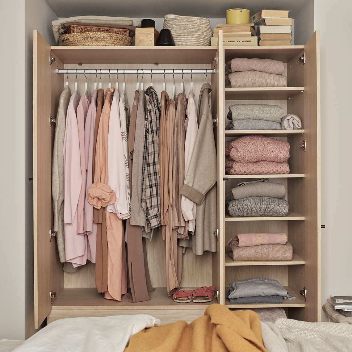 - Spersonalizuj wygląd szafy, dobierając do niej praktyczne elementy. Do wyboru są części o różnych wielkościach: półki (88 cm lub 42,5 cm), szuflady (o szerokości 50 lub 100 cm) i drążki na wieszaki (długie – 88 cm lub krótsze – 42,5 cm).