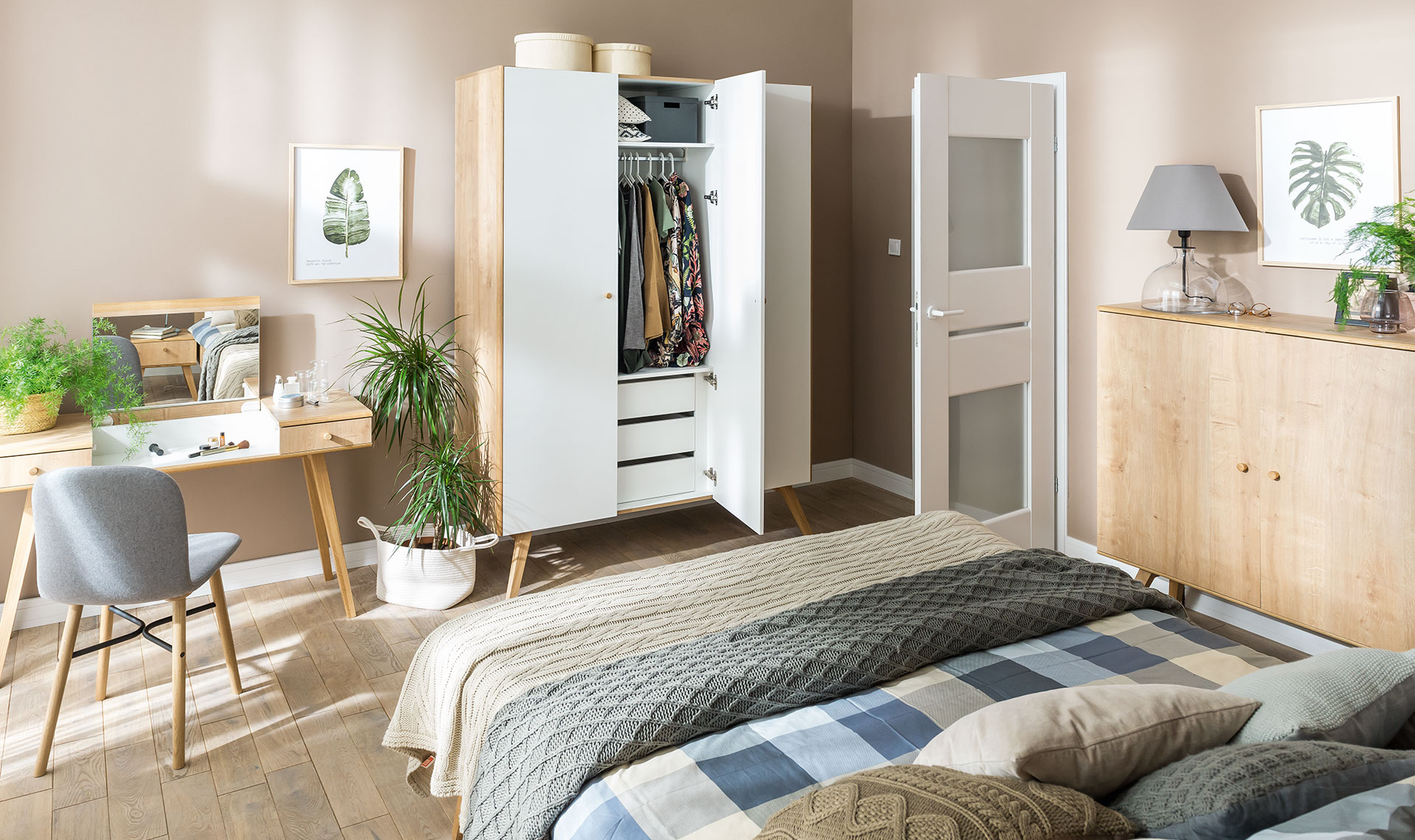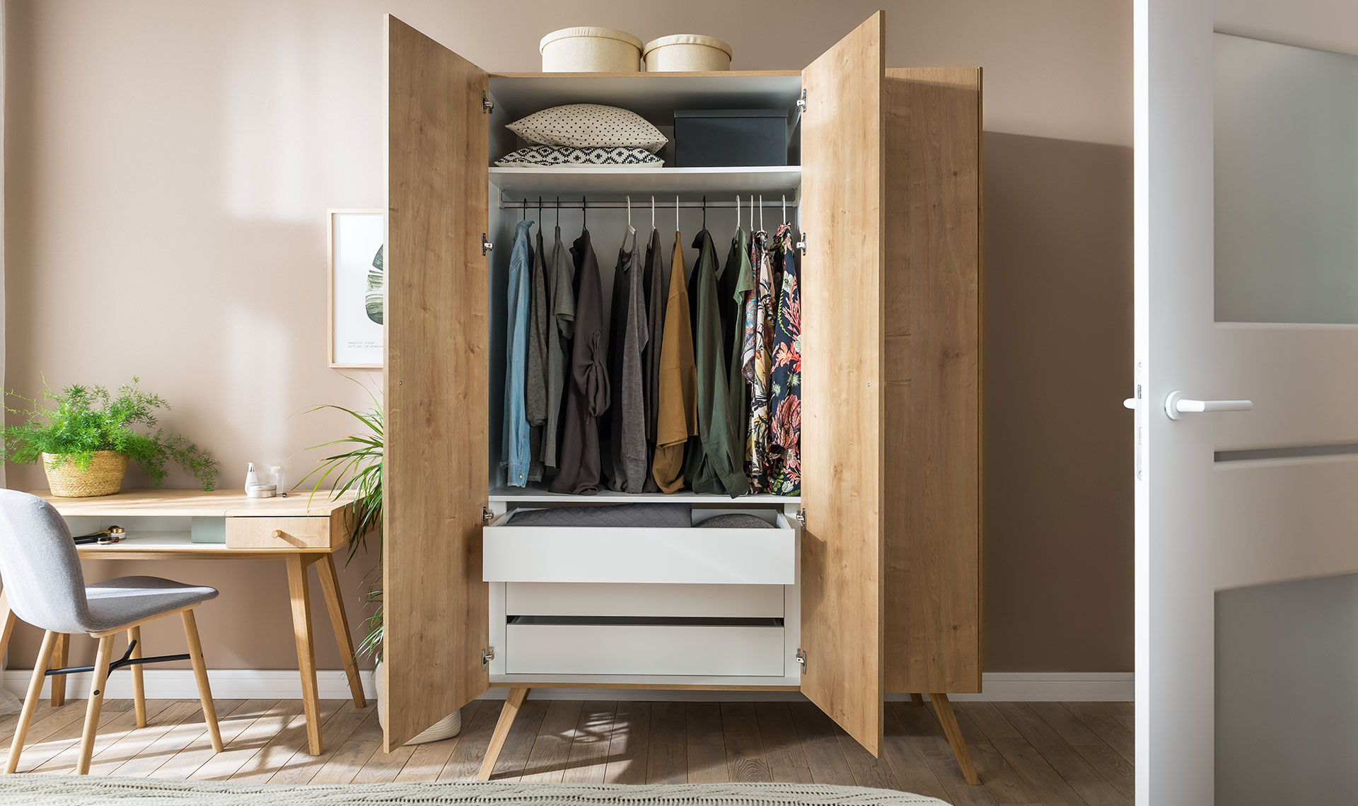 - Za dwuskrzydłowymi drzwiami znajdziesz otwartą przestrzeń z drążkiem na koszule, marynarki i sukienki. Trzy pojemne szuflady w dolnej części pomogą Ci posegregować bieliznę czy akcesoria.