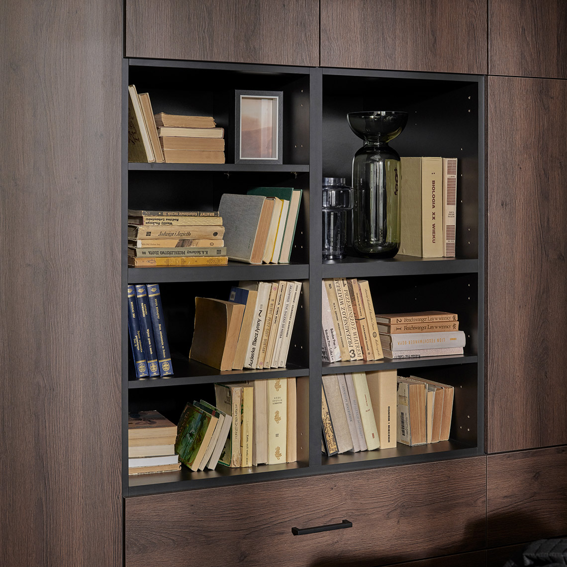 - Skonfiguruj wnętrze szafy, dobierając odpowiednie drążki (o długości 42,5 lub 88 cm), podwójne szuflady na ubrania, bieliznę i dodatki (o szerokości 50 lub 100 cm, z białymi wnętrzami) oraz półki regulowane na trzech poziomach (krótkie – 42,5 cm lub długie – 88 cm).