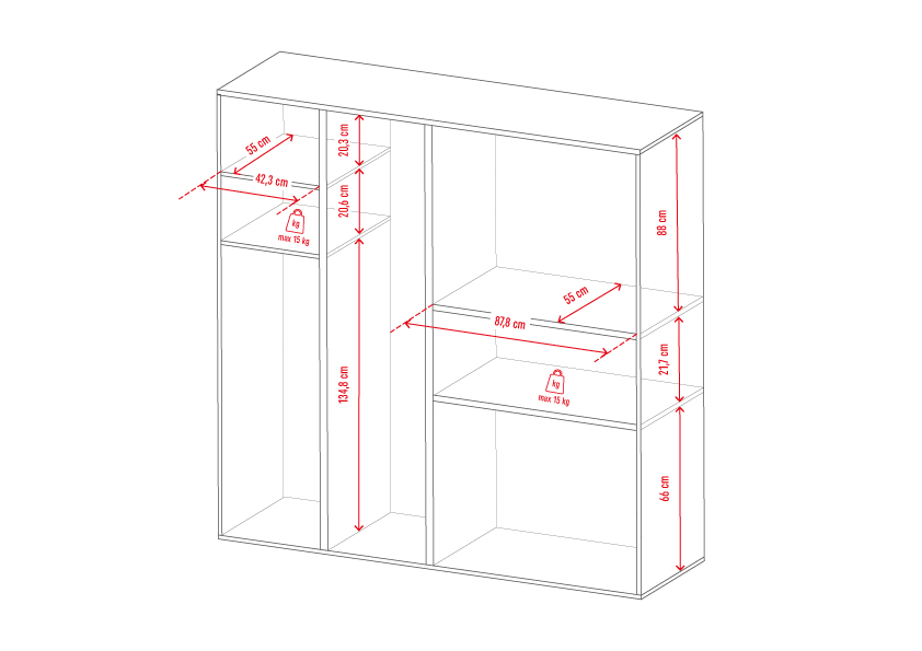 - Przegrody: płyta laminowana o grubości 32 mm.