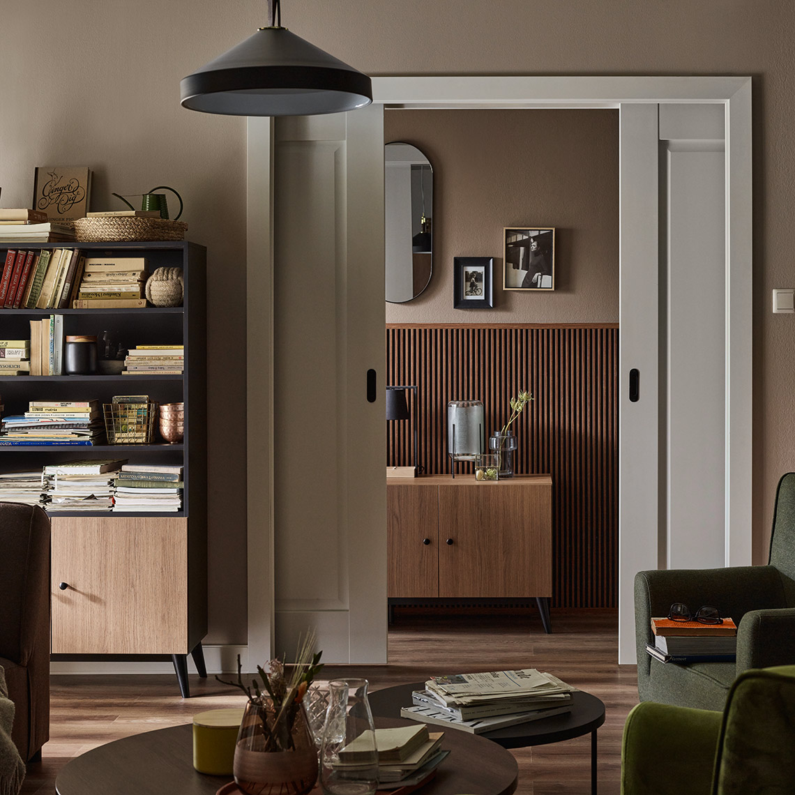 - Rozstrzygnij o konfiguracji przestrzeni wewnątrz mebla, wybierając liczbę i umiejscowienie półek, szuflad oraz drzwi.