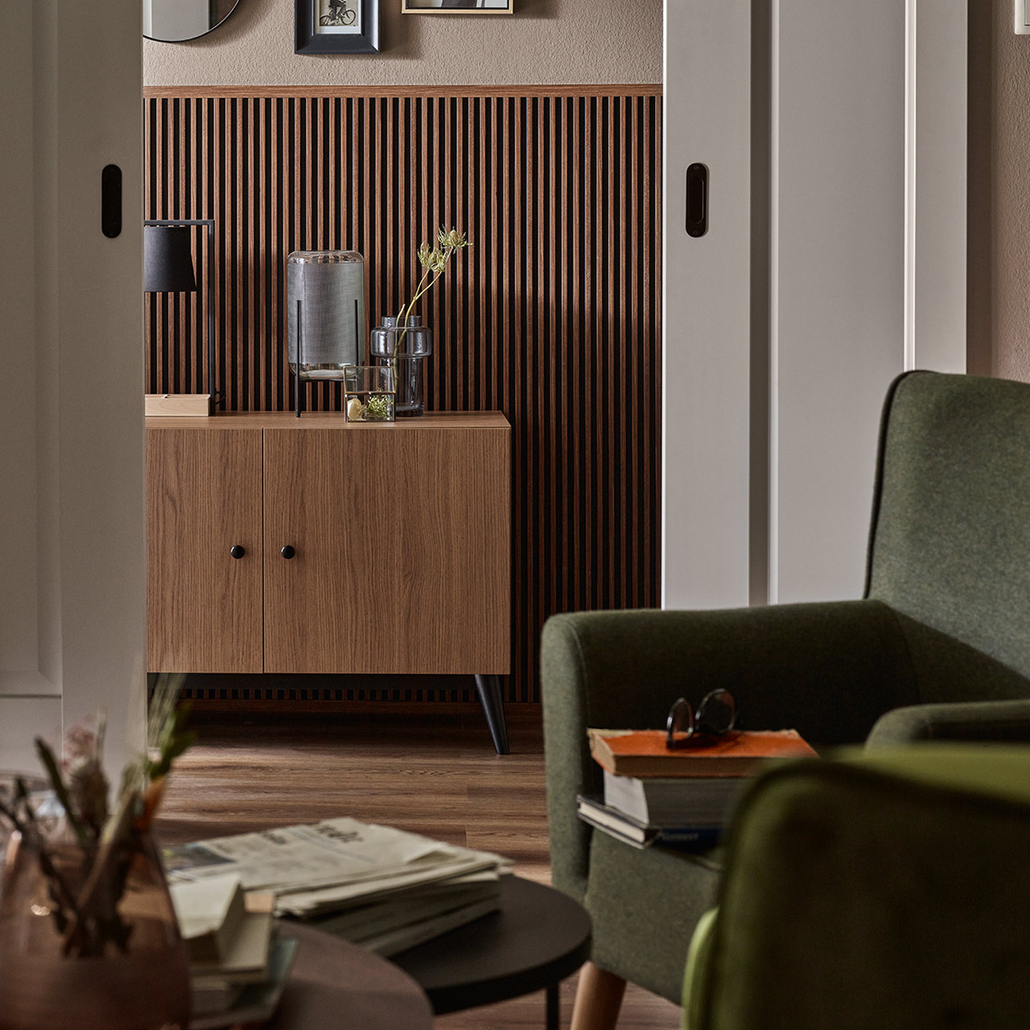 - Do szafki możesz wybrać listwę oświetleniową LED, którą możesz łatwo przykleić do dołu wybranej półki. Montując ją bliżej ściany tylnej w otwartych przestrzeniach można jeszcze lepiej wyeksponować przedmioty na półce. W celu podświetlenia wnętrza szuflad listwę LED należy przykleić bliżej przodu mebla. Wraz z oświetleniem otrzymasz bezprzewodowy włącznik, który można magnetycznie przymocować w najwygodniejszym miejscu.